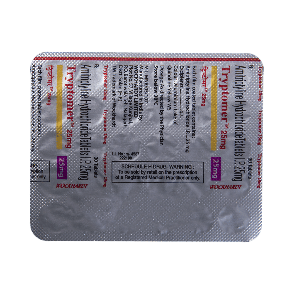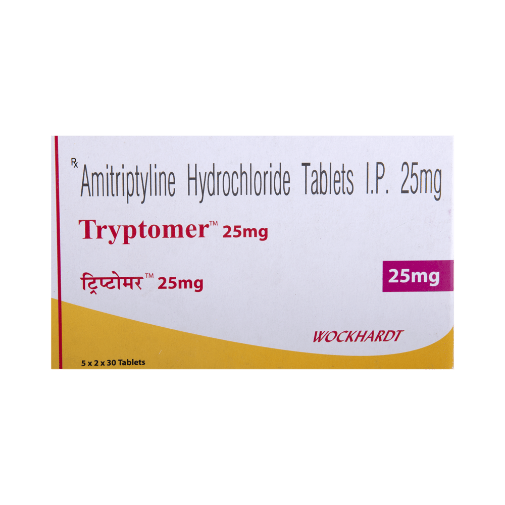 Tryptomer 25mg Tablet is a medicine used to treat depression by helping improve mood and reduce anxiety. It works by restoring the natural balance of certain brain chemicals that affect emotions. This helps relieve sadness, improves mental well-being, and makes daily life easier to manage. Tryptomer 25mg Tablet is normally taken before bedtime because it can make you sleepy. It can be taken with or without food. The dose and how often you need to take it will be decided by your doctor so that you get the right amount to control your symptoms.How long you need to use it will depend on what you are taking it for, but it is important to continue taking this medication even if you feel well. Do not stop taking the medicine suddenly without talking to your doctor. Stopping the medicine suddenly can worsen your condition or cause other symptoms. Your dose may be modified or gradually decreased before stopping the medication.The most common side effects of this medicine include constipation, dry mouth, sleepiness, dizziness, and headache. It may also make you aggressive or confused, and can cause weight gain in some people.This medicine is not addictive, but you can experience additional side effects (withdrawal symptoms) if you stop taking it suddenly. Your doctor may be able to suggest ways of preventing or reducing side effects if they bother you or do not go away. Serious side effects associated with this medicine are rare.