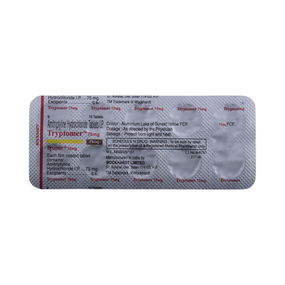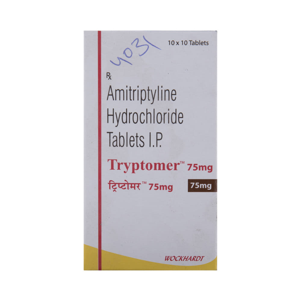 Tryptomer 75mg Tablet is a medicine used to treat depression by helping improve mood and reduce anxiety. It works by restoring the natural balance of certain brain chemicals that affect emotions. This helps relieve sadness, improves mental well-being, and makes daily life easier to manage. Tryptomer 75mg Tablet is normally taken before bedtime because it can make you sleepy. It can be taken with or without food. The dose and how often you need to take it will be decided by your doctor so that you get the right amount to control your symptoms.How long you need to use it will depend on what you are taking it for, but it is important to continue taking this medication even if you feel well. Do not stop taking the medicine suddenly without talking to your doctor. Stopping the medicine suddenly can worsen your condition or cause other symptoms. Your dose may be modified or gradually decreased before stopping the medication.The most common side effects of this medicine include constipation, dry mouth, sleepiness, dizziness, and headache. It may also make you aggressive or confused, and can cause weight gain in some people.This medicine is not addictive, but you can experience additional side effects (withdrawal symptoms) if you stop taking it suddenly. Your doctor may be able to suggest ways of preventing or reducing side effects if they bother you or do not go away. Serious side effects associated with this medicine are rare.