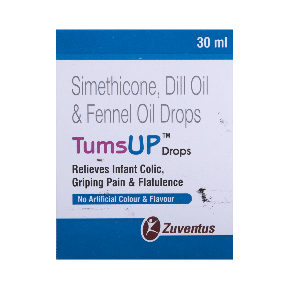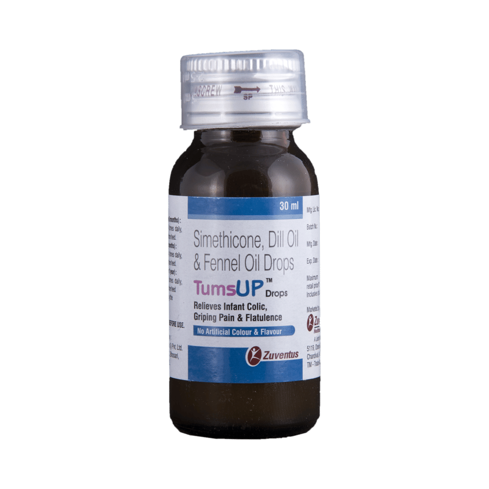 Tumsup Drop is a combination of three medicines and is given to children to reduce abdominal pain, bloating, discomfort, and cramps. It neutralizes excessive acid in the stomach and helps in the easy passage of gas. It also relieves spasms by relaxing the stomach and gut muscles. Give Tumsup Drop to your child by mouth, either before or after food. Prefer giving it after food if it causes stomach upset. Usually, it is given 4 to 5 times a day after meals. But, this dosing may vary, depending upon the clinical condition, body weight, and age of your child. Do not stop this medicine abruptly by yourself as it may bring back the symptoms or worsen your child’s condition. If your child vomits within 30 minutes of the intake of this medicine, help the child calm down and repeat the dose. However, if it is already time for the next dose, do not double the dose.You must let your child’s doctor know about all the medicines your child is being given. Also, inform the doctor of any previous history of allergy, intolerance to any food products, abdominal obstruction, liver impairment, kidney malfunction, or any birth defects. This information is very important for dose alterations and for planning your child’s overall treatment.