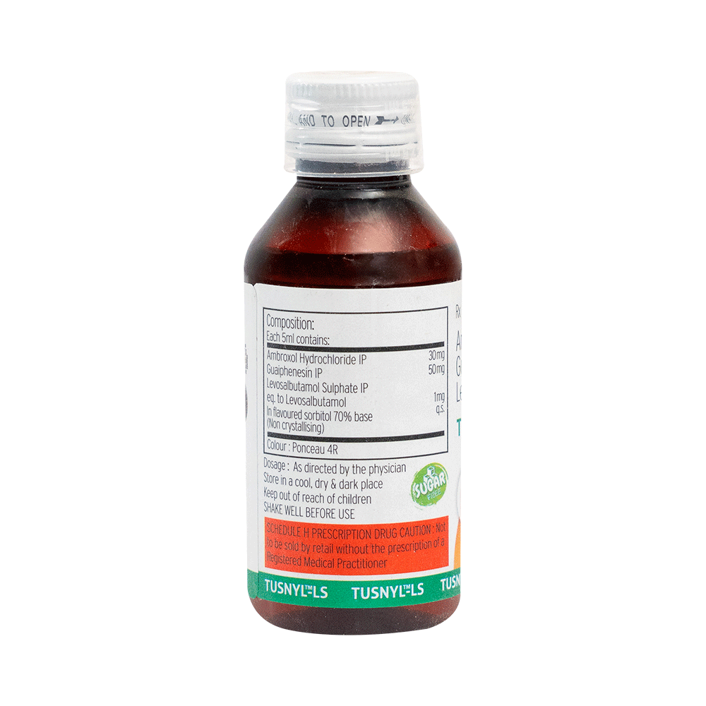 Tusnyl-LS Syrup Strawberry Sugar Free is a combination of three medicines: Levosalbutamol, Ambroxol and Guaifenesin which relieve cough with mucus. Levosalbutamol is a bronchodilator. It works by relaxing the muscles in the airways and widens airways. Ambroxol is a mucolytic which thins and loosens mucus (phlegm), making it easier to cough out. Guaifenesin is an expectorant which decreases the stickiness of mucus (phlegm) and helps in its removal from the airways.
