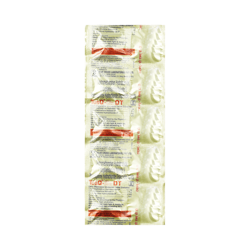 TusQ-DX DT Tablet is a medicine used in the treatment of common cold and cough. It can provide quick relief from cough and common cold symptoms like runny nose, stuffy nose, sneezing, watery eyes, and congestion or stuffiness. TusQ-DX DT Tablet is taken with or without food in a dose and duration as advised by the doctor. The dose you are given will depend on your condition and how you respond to the medicine. You should keep taking this medicine for as long as your doctor recommends. If you stop treatment too early your symptoms may come back and your condition may worsen. Let your healthcare team know about all other medications you are taking as some may affect, or be affected by this medicine.Common side effects of this medicine include headache, sedation, double vision, vomiting, diarrhea, dry mouth, and nausea. Most of these are temporary and usually resolve with time. Contact your doctor straight away if you are at all concerned about any of these side effects. This medicine can also cause sleepiness, so do not drive or do anything that requires mental focus until you know how this medicine affects you. Avoid drinking alcohol while taking this medicine as it can worsen your sleepiness.Never support self-medication or recommend your medicine to another person. It is beneficial to have plenty of fluids while taking this medication. Before taking this medicine, you should tell your doctor if you are pregnant, planning pregnancy or breastfeeding. You should also tell your doctor if you have any kidney or liver diseases so that your doctor can prescribe a suitable dose for you.
