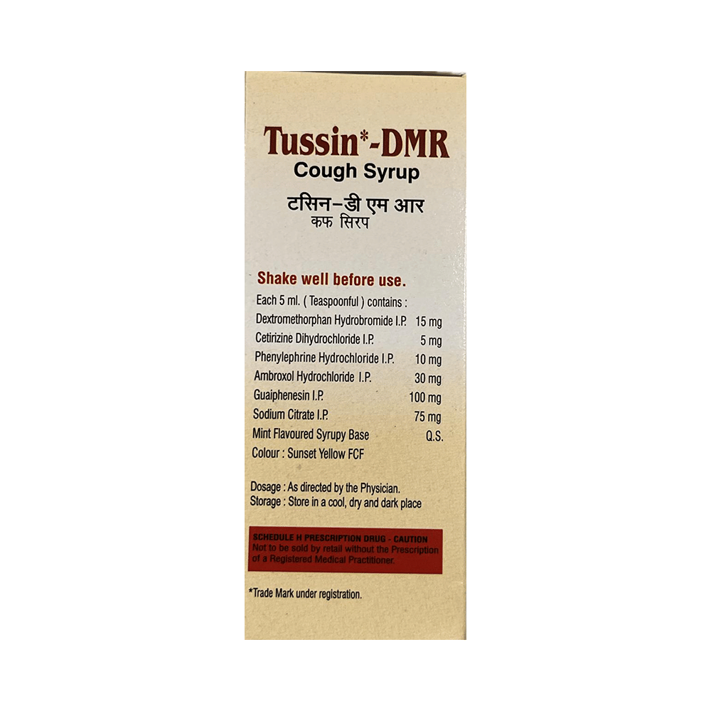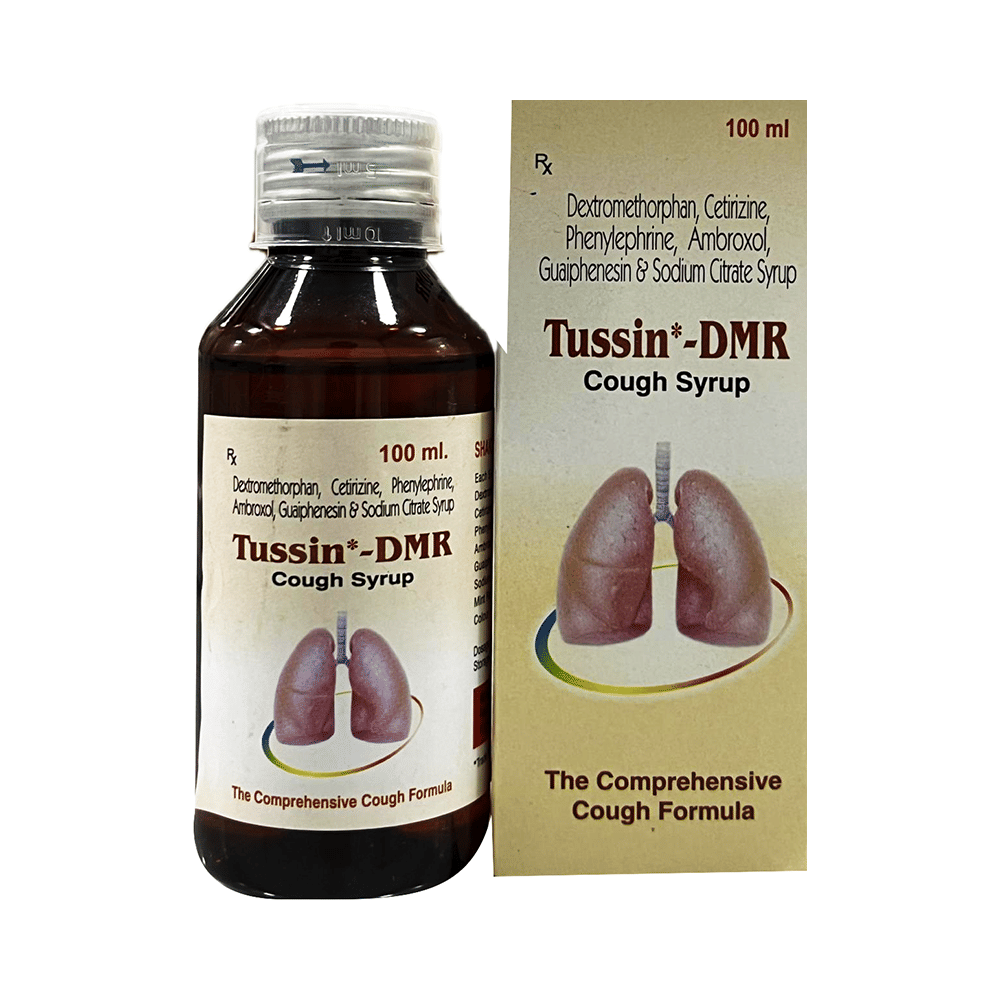 Tussin-DMR Syrup is a combination medicine used to treat dry cough. It narrows the small blood vessels and relieves congestion or stuffiness in the nose. It also reduces allergy symptoms like watery eyes, sneezing, runny nose, and throat irritation. Tussin-DMR Syrup may be taken with or without food in a dose and duration as the doctor advises. Your dose will depend on your condition and how you respond to the medicine. You should keep taking this medicine for as long as your doctor recommends. If you stop treatment too early, your symptoms may come back, and your condition may worsen. Let your doctor know about all other medications you are taking, as some may affect or be affected by this medicine.Common side effects of this medication include sedation (sleepiness), dry mouth, nausea, vomiting, dizziness, gastrointestinal discomfort, and headache. Most of these are temporary and usually resolve with time. Let your doctor know if you are concerned about these side effects. This medicine can also cause dizziness and sleepiness, so do not drive or do anything that requires mental focus until you know how this medicine affects you. Avoid drinking alcohol while taking this medicine, as it can make dizziness worse.Never support self-medication or recommend your medicine to another person. Keep it out of reach of children. It is beneficial to have plenty of fluids while taking this medication. Before taking it, you should tell your doctor if you have any kidney or liver diseases so that your doctor can prescribe a suitable dose for you. Pregnant or breastfeeding women should also consult their doctor before taking this medicine.