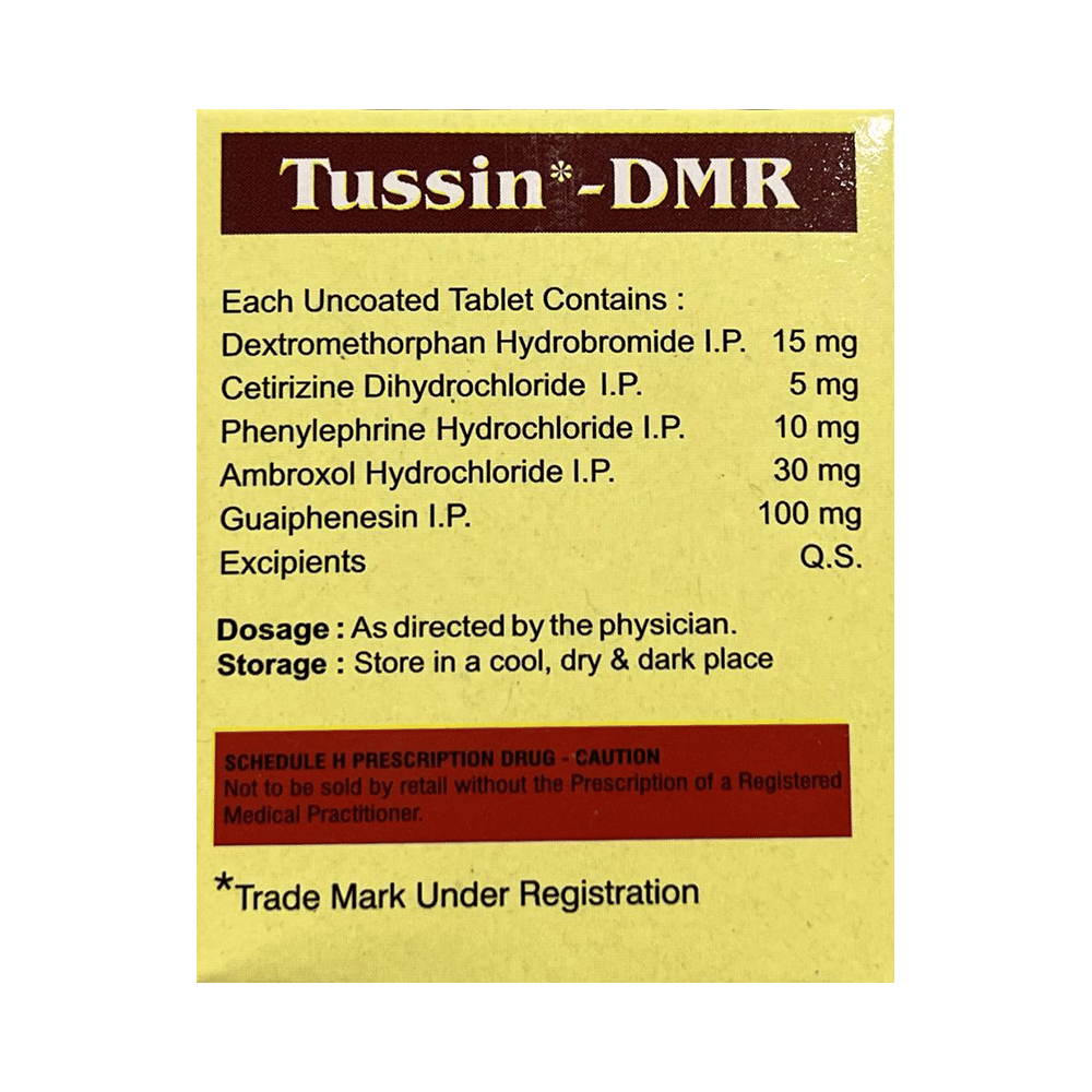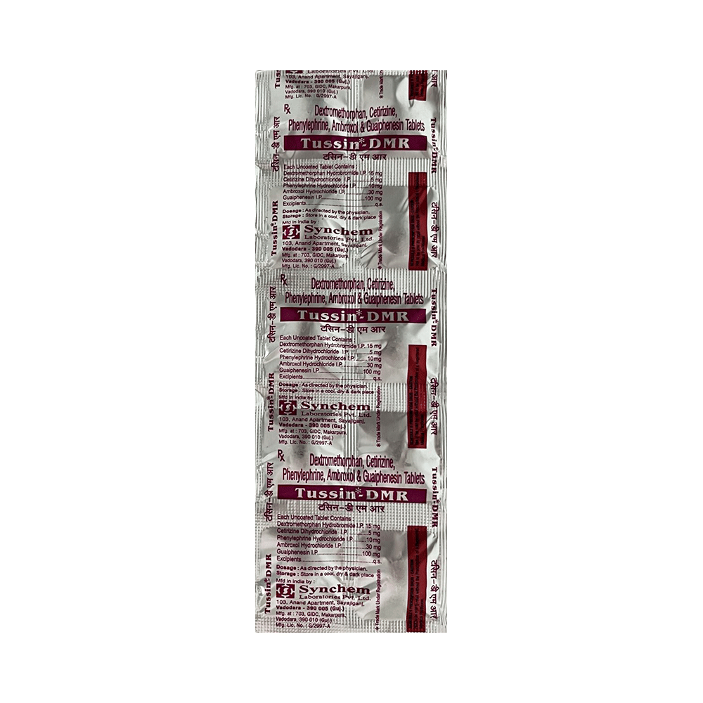 Tussin-DMR Tablet is a combination of five medicines: Ambroxol, Cetirizine, Dextromethorphan Hydrobromide, Guaifenesin and Phenylephrine.