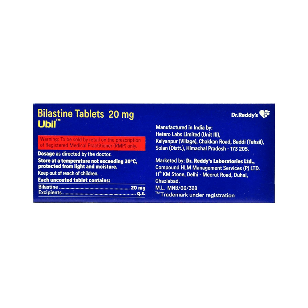 Ubil Tablet is an antiallergic medication. It treats allergy symptoms such as such as itching, swelling, and rashes by blocking the effects of a chemical messenger (histamine) in the body.