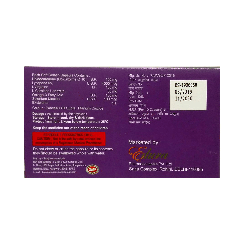 Salt Composition: Coenzyme Q10 (100mg) + Levo-carnitine (50mg) + L-Arginine (100mg) + Lycopene (4000mcg) + Selenium (100mcg) + Omega-3 fatty acid (150mg)
