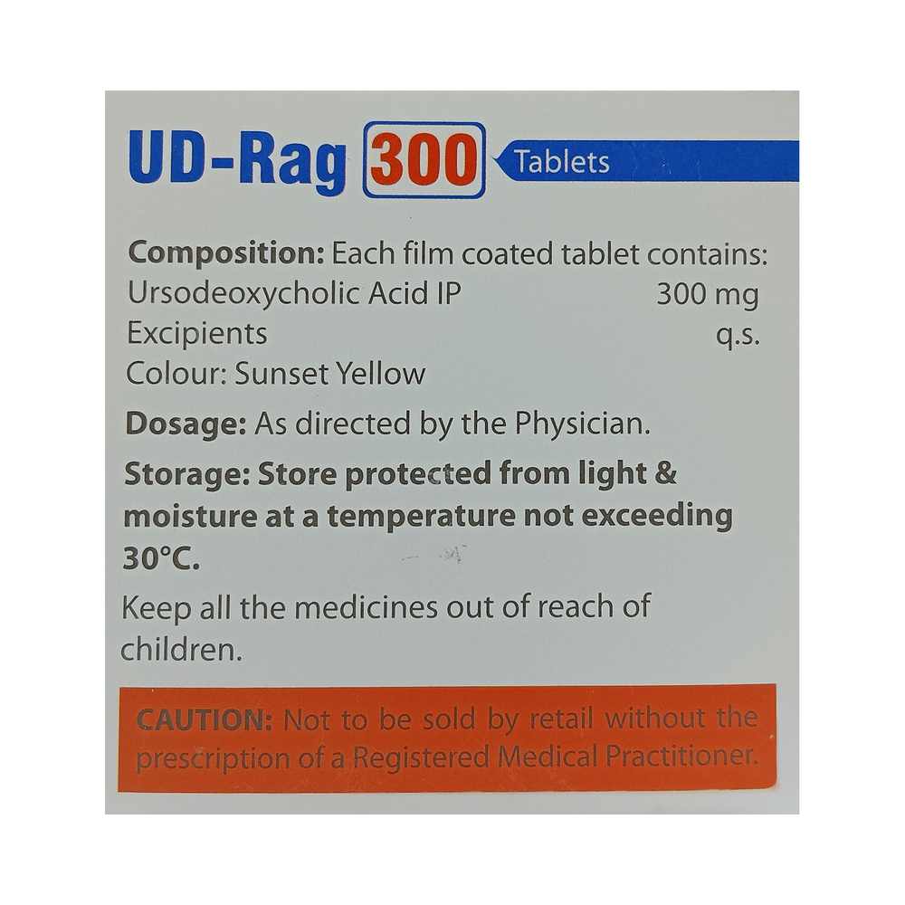UD-Rag 300 Tablet is a medicine used to dissolve certain gallstones and prevent them from forming. It helps break down the cholesterol that has converted into stones in your gallbladder, thereby dissolving the stones. It is also used to treat a type of liver disease called primary biliary cirrhosis. UD-Rag 300 Tablet should be swallowed whole after a meal and with a glass of milk or water. The dose will depend on what you are being treated for and your health condition. Take it regularly to get maximum benefit, and keep taking it for as long as prescribed (several months or longer). Keep taking it even if your symptoms disappear.The most common side effects of UD-Rag 300 Tablet are abdominal pain, diarrhea, hair loss, itching, nausea, and rash. Not everyone gets these side effects. If you are worried about them or they do not go away, let your doctor know. They may be able to suggest ways to manage them or prescribe an alternative medicine.Before taking this medicine, you should tell your doctor if you have an inflammation of the gallbladder or bile ducts, frequent cramp-like pain in your upper abdomen, coughing up blood, or gaining weight rapidly. Using this medicine can reduce or increase the effect of some other medicines, so tell your doctor about all the other medicines you are taking. Pregnant and breastfeeding women should consult their doctor before using this medicine to make sure it is safe for them.