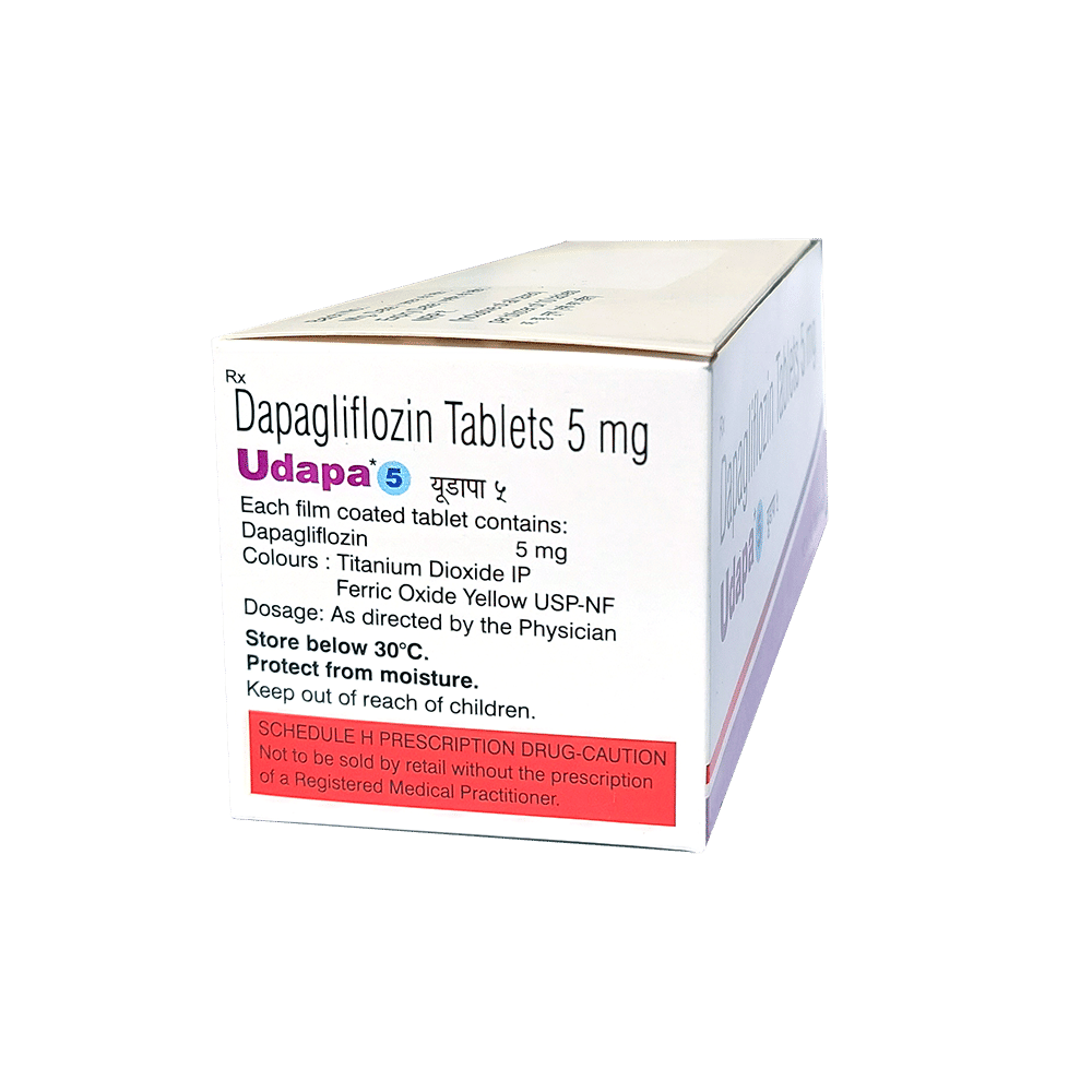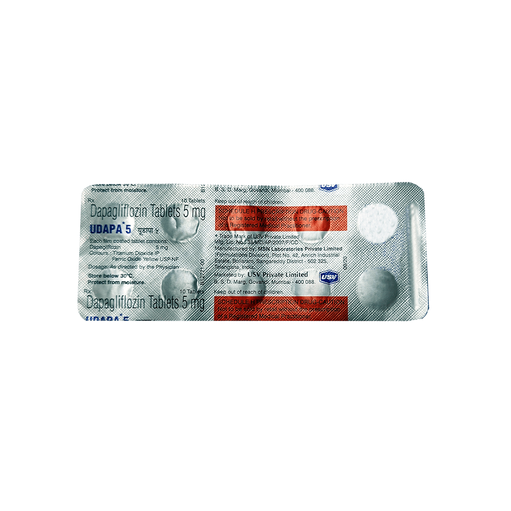 Udapa 5 Tablet is used alone or in combination with other medicines to treat type 2 diabetes mellitus. It helps control the high blood sugar levels seen in diabetes. This reduces the chances of serious complications of diabetes and also helps prevent heart disease. Udapa 5 Tablet can be taken with or without food at any time of day, but you should try to take it at the same time every day. The dose will be decided by your doctor. Do not stop taking it without asking your doctor. If you do, your blood sugar levels may increase and put you at risk of serious complications like kidney damage and blindness. This medicine is only part of a treatment program that should include a healthy diet, regular exercise, and weight reduction as advised by your doctor.The most common side effects of Udapa 5 Tablet include nausea, fungal infection of the vagina, nasopharyngitis (inflammation of the throat and nasal passages), and urinary tract infections. It may cause the body to lose too much water. Drink plenty of fluids to prevent dehydration. Maintaining good hygiene can help prevent the development of fungal infections in the genital area.Before taking this medicine, inform your doctor if you have any kidney or liver problems or a urinary tract infection, or if you are on water pills (diuretics). Pregnant or breastfeeding women should also consult their doctor before taking it. Avoid excessive alcohol intake while taking it, as this may increase the risk of developing some side effects. Monitor your blood sugar levels regularly while taking this medicine.