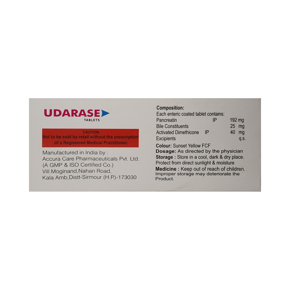 Udarase Tablet is a combination medicine used in the treatment of pancreatic enzyme deficiency. It helps treat indigestion, disintegrates gas bubbles and allows easy passage of gas. Udarase Tablet is taken with or without food in a dose and duration as advised by the doctor. The dose you are given will depend on your condition and how you respond to the medicine. You should keep taking this medicine for as long as your doctor recommends. If you stop treatment too early your symptoms may come back and your condition may worsen. Let your healthcare team know about all other medications you are taking as some may affect, or be affected by this medicine.Before taking this medicine, you should tell your doctor if you are pregnant, planning pregnancy or breastfeeding. You should tell your doctor if you have any kidney or liver diseases so that your doctor can prescribe a suitable dose for you.