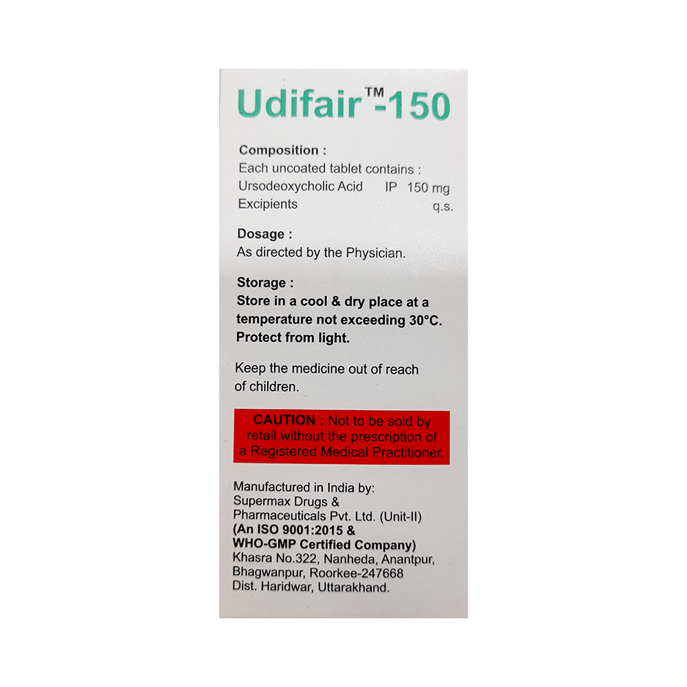 Udifair 150 Tablet is a medicine used to dissolve certain gallstones and prevent them from forming. It helps break down the cholesterol that has converted into stones in your gallbladder, thereby dissolving the stones. It is also used to treat a type of liver disease called primary biliary cirrhosis. Udifair 150 Tablet should be swallowed whole after a meal and with a glass of milk or water. The dose will depend on what you are being treated for and your health condition. Take it regularly to get maximum benefit, and keep taking it for as long as prescribed (several months or longer). Keep taking it even if your symptoms disappear.The most common side effects of Udifair 150 Tablet are abdominal pain, diarrhea, hair loss, itching, nausea, and rash. Not everyone gets these side effects. If you are worried about them or they do not go away, let your doctor know. They may be able to suggest ways to manage them or prescribe an alternative medicine.Before taking this medicine, you should tell your doctor if you have an inflammation of the gallbladder or bile ducts, frequent cramp-like pain in your upper abdomen, coughing up blood, or gaining weight rapidly. Using this medicine can reduce or increase the effect of some other medicines, so tell your doctor about all the other medicines you are taking. Pregnant and breastfeeding women should consult their doctor before using this medicine to make sure it is safe for them.