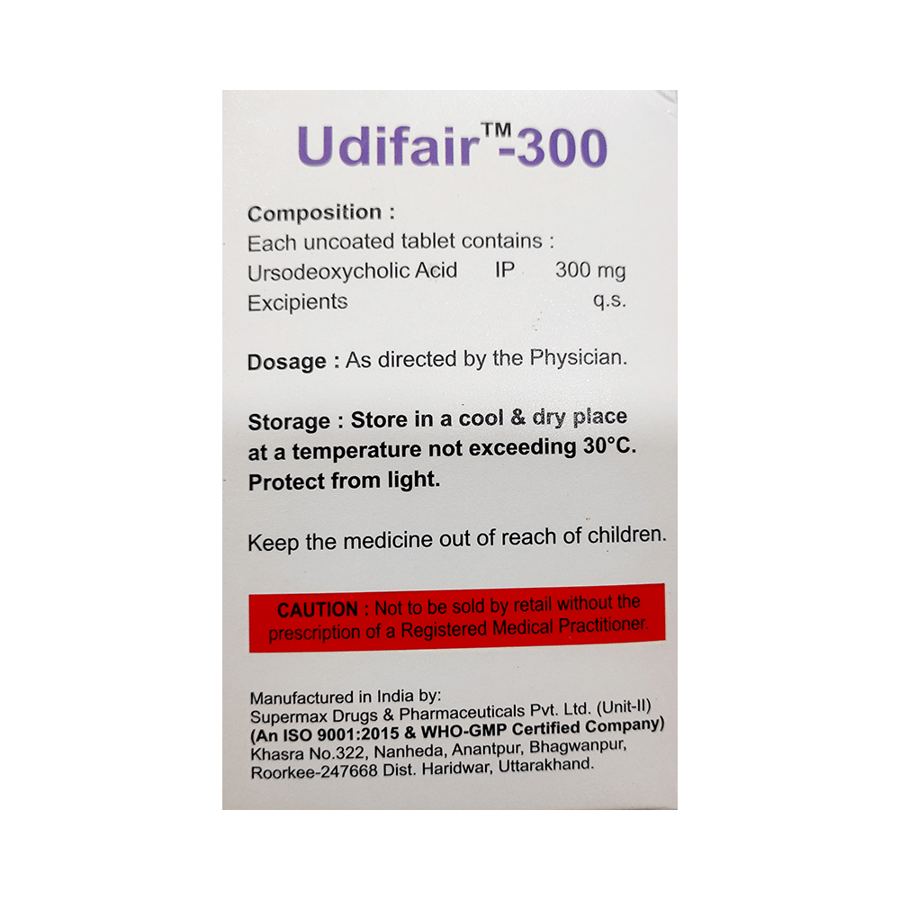 Udifair 300 Tablet is a medicine used to dissolve certain gallstones and prevent them from forming. It helps break down the cholesterol that has converted into stones in your gallbladder, thereby dissolving the stones. It is also used to treat a type of liver disease called primary biliary cirrhosis. Udifair 300 Tablet should be swallowed whole after a meal and with a glass of milk or water. The dose will depend on what you are being treated for and your health condition. Take it regularly to get maximum benefit, and keep taking it for as long as prescribed (several months or longer). Keep taking it even if your symptoms disappear.The most common side effects of Udifair 300 Tablet are abdominal pain, diarrhea, hair loss, itching, nausea, and rash. Not everyone gets these side effects. If you are worried about them or they do not go away, let your doctor know. They may be able to suggest ways to manage them or prescribe an alternative medicine.Before taking this medicine, you should tell your doctor if you have an inflammation of the gallbladder or bile ducts, frequent cramp-like pain in your upper abdomen, coughing up blood, or gaining weight rapidly. Using this medicine can reduce or increase the effect of some other medicines, so tell your doctor about all the other medicines you are taking. Pregnant and breastfeeding women should consult their doctor before using this medicine to make sure it is safe for them.