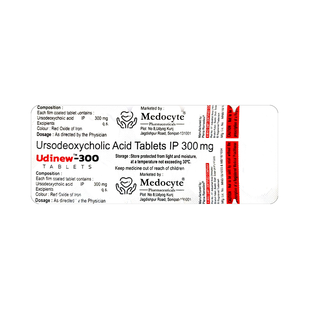 In Treatment of Gallbladder stonesUdinew 300 Tablet is a medicine that helps decreases the amount of cholesterol produced by your liver. It helps to break down cholesterol that has formed into “stones†in the gallbladder. It may take several months to completely dissolve the stone, so you need to take the medicine regularly and as long as the doctor has prescribed it for it to be effective. There might be other medicines and certain lifestyle changes that can reduce your cholesterol level and make gallstones less likely, consult with your doctor.In Treatment of Primary biliary cirrhosisPrimary biliary cholangitis is a type of liver disease that gradually gets worse over time. It does not always have symptoms but, over time, it can lead to liver failure. Udinew 300 Tablet is used to treat this condition and may be used by itself or with other medicines. It can help prevent or delay liver damage in most people, especially if you start taking it in the early stages. Once you start this treatment, you will likely be taking it for the rest of your life. To make the medicine more effective and for general health benefits, you can help yourself by stopping smoking, keeping a healthy weight, and not drinking too much alcohol.show moreshow less