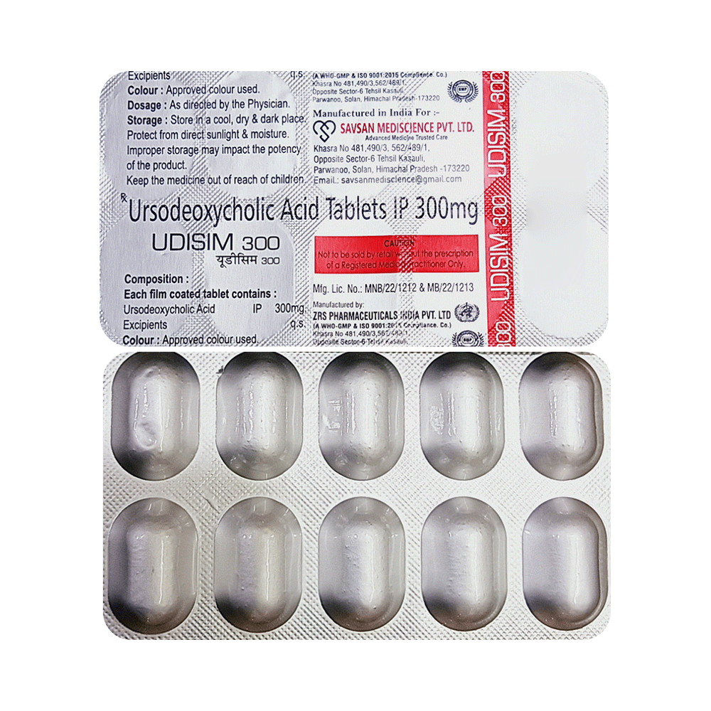 In Treatment of Gallbladder stonesUdisim 300 Tablet is a medicine that helps decreases the amount of cholesterol produced by your liver. It helps to break down cholesterol that has formed into “stones†in the gallbladder. It may take several months to completely dissolve the stone, so you need to take the medicine regularly and as long as the doctor has prescribed it for it to be effective. There might be other medicines and certain lifestyle changes that can reduce your cholesterol level and make gallstones less likely, consult with your doctor.In Treatment of Primary biliary cirrhosisPrimary biliary cholangitis is a type of liver disease that gradually gets worse over time. It does not always have symptoms but, over time, it can lead to liver failure. Udisim 300 Tablet is used to treat this condition and may be used by itself or with other medicines. It can help prevent or delay liver damage in most people, especially if you start taking it in the early stages. Once you start this treatment, you will likely be taking it for the rest of your life. To make the medicine more effective and for general health benefits, you can help yourself by stopping smoking, keeping a healthy weight, and not drinking too much alcohol.show moreshow less