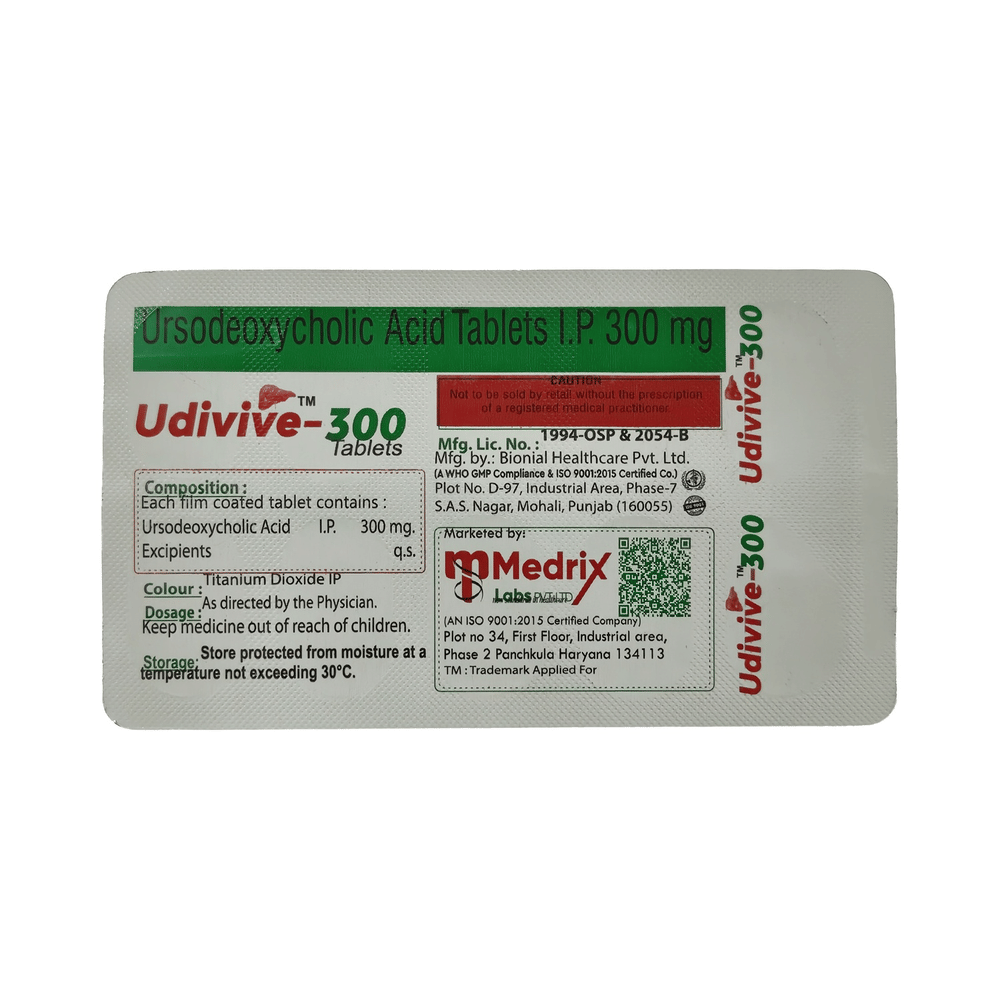 In Treatment of Gallbladder stonesUdivive 300mg Tablet is a medicine that helps decreases the amount of cholesterol produced by your liver. It helps to break down cholesterol that has formed into “stones†in the gallbladder. It may take several months to completely dissolve the stone, so you need to take the medicine regularly and as long as the doctor has prescribed it for it to be effective. There might be other medicines and certain lifestyle changes that can reduce your cholesterol level and make gallstones less likely, consult with your doctor.In Treatment of Primary biliary cirrhosisPrimary biliary cholangitis is a type of liver disease that gradually gets worse over time. It does not always have symptoms but, over time, it can lead to liver failure. Udivive 300mg Tablet is used to treat this condition and may be used by itself or with other medicines. It can help prevent or delay liver damage in most people, especially if you start taking it in the early stages. Once you start this treatment, you will likely be taking it for the rest of your life. To make the medicine more effective and for general health benefits, you can help yourself by stopping smoking, keeping a healthy weight, and not drinking too much alcohol.show moreshow less