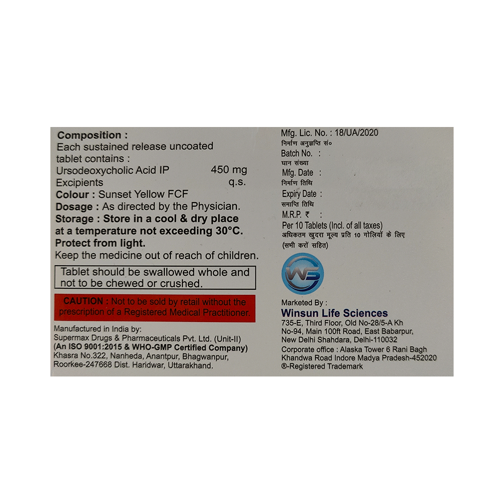 In Treatment of Gallbladder stonesUdnus SR 450 Tablet is a medicine that helps decreases the amount of cholesterol produced by your liver. It helps to break down cholesterol that has formed into “stones†in the gallbladder. It may take several months to completely dissolve the stone, so you need to take the medicine regularly and as long as the doctor has prescribed it for it to be effective. There might be other medicines and certain lifestyle changes that can reduce your cholesterol level and make gallstones less likely, consult with your doctor.In Treatment of Primary biliary cirrhosisPrimary biliary cholangitis is a type of liver disease that gradually gets worse over time. It does not always have symptoms but, over time, it can lead to liver failure. Udnus SR 450 Tablet is used to treat this condition and may be used by itself or with other medicines. It can help prevent or delay liver damage in most people, especially if you start taking it in the early stages. Once you start this treatment, you will likely be taking it for the rest of your life. To make the medicine more effective and for general health benefits, you can help yourself by stopping smoking, keeping a healthy weight, and not drinking too much alcohol.show moreshow less