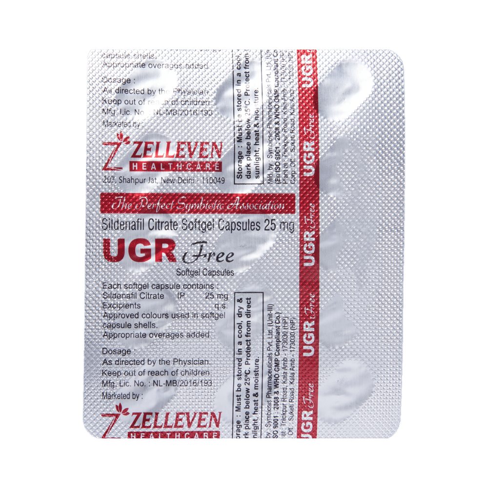 UGR Free Softgel Capsule is used to treat erectile dysfunction in men. It increases blood flow to the penis to help men get an erection. It works by helping to relax the blood vessels in your penis, allowing blood to flow into your penis when you get sexually excited. UGR Free Softgel Capsule may be taken on an empty stomach or with a meal. It should be strictly taken as advised by your doctor. You should take it about one hour before you plan to have sex. The amount of time it takes to work varies from person to person, but it normally takes between 30 minutes and one hour. This medicine will only help you to get an erection if you are sexually stimulated. However, you should not take this medicine if you do not have erectile dysfunction. It should not be taken more than once a day.The most common side effects of this medicine are flushing, headaches, dizziness, blurred vision, muscle pain, stomach upset, and rash. Talk to your doctor if any of these side effects persist or bother you. They may be able to help you manage the side effects.This medicine is not intended for use by women and men should avoid using any other medicines to treat impotence without talking to a doctor first. It can be dangerous to take it along with medicines called nitrates (often given for chest pain or angina). Do not take this medicine if you have severe heart or liver problems, if you have recently had a stroke or heart attack or if you have low blood pressure. Let your doctor know if you suffer from these or any other health problems before taking it. You should not drive if this medicine makes you feel dizzy. Avoid drinking alcohol while taking this medicine as it increases the chances of side effects.
