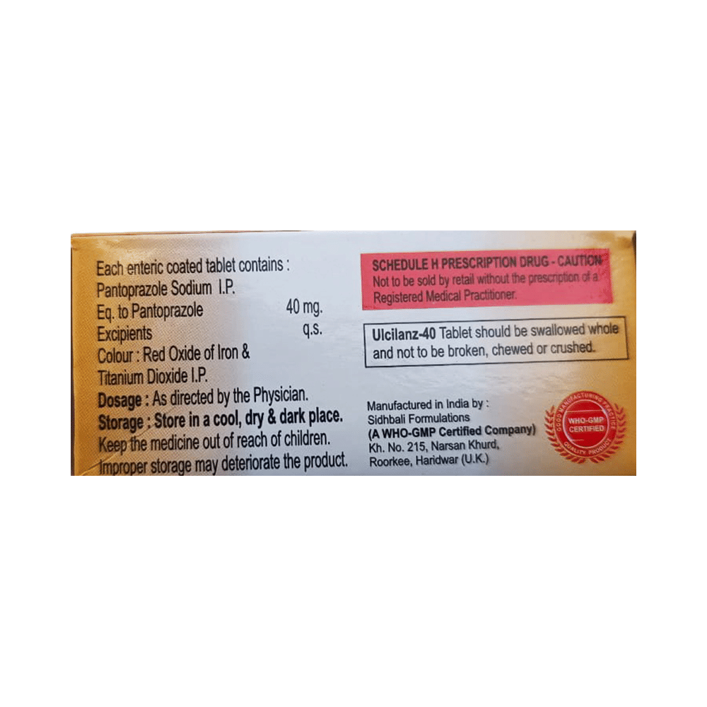 Ulcilanz 40 Tablet EC is a medicine that reduces the amount of acid produced in your stomach. It is used for treating acid-related diseases of the stomach and intestine such as heartburn, acid reflux, peptic ulcer disease, and Zollinger-Ellison syndrome. It provides relief from the symptoms and promotes healing. Ulcilanz 40 Tablet EC is also used to prevent stomach ulcers and acidity that may be seen with the prolonged use of painkillers. It belongs to a class of medicines known as proton pump inhibitors (PPIs). This medicine should be taken one hour before a meal, preferably in the morning. The dose will depend on your underlying condition and how you respond to the medicine. You should keep on taking it as prescribed even if your symptoms disappear quickly. You can increase the efficiency of the treatment by eating smaller meals more often and avoiding caffeinated drinks (like tea and coffee), and spicy or fatty foods.The most common side effects observed with this medicine include nausea, vomiting, headache, dizziness, flatulence, diarrhea, and stomach pain. These symptoms are generally mild but if they bother you or do not go away, consult your doctor. Long-term use of this medicine may lead to an increased risk of side effects. For instance, using this medicine for more than 1 year may increase your risk for bone fractures, especially with higher doses. Talk to your doctor about ways to prevent bone loss (osteoporosis), like taking calcium and vitamin D supplements.Before taking this medicine, you need to tell your doctor if you have severe liver problems, are taking medicines for HIV, have ever had an allergic reaction to similar medicines in the past, or suffer from bone loss (osteoporosis). Pregnant or breastfeeding women should also consult their doctor before taking it.