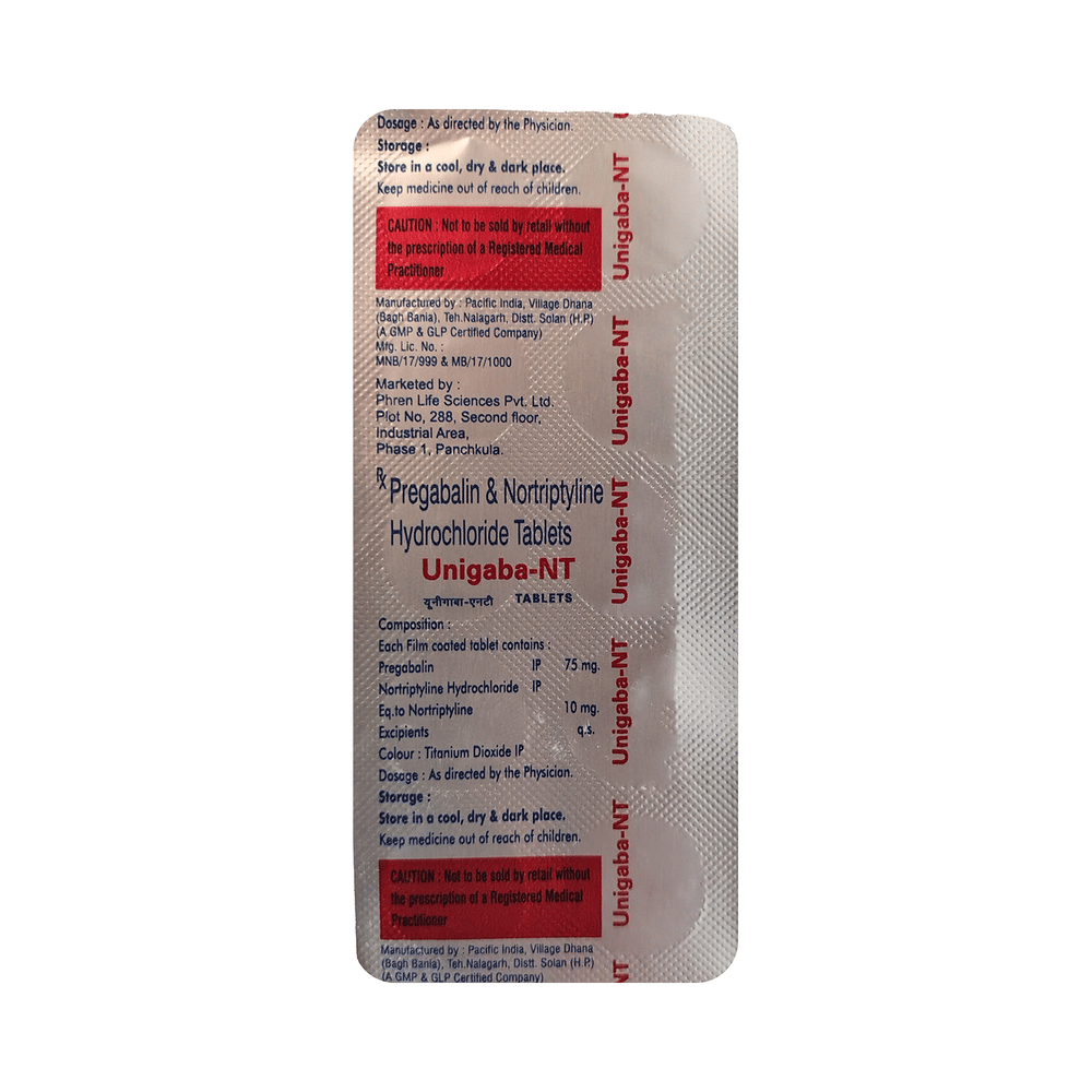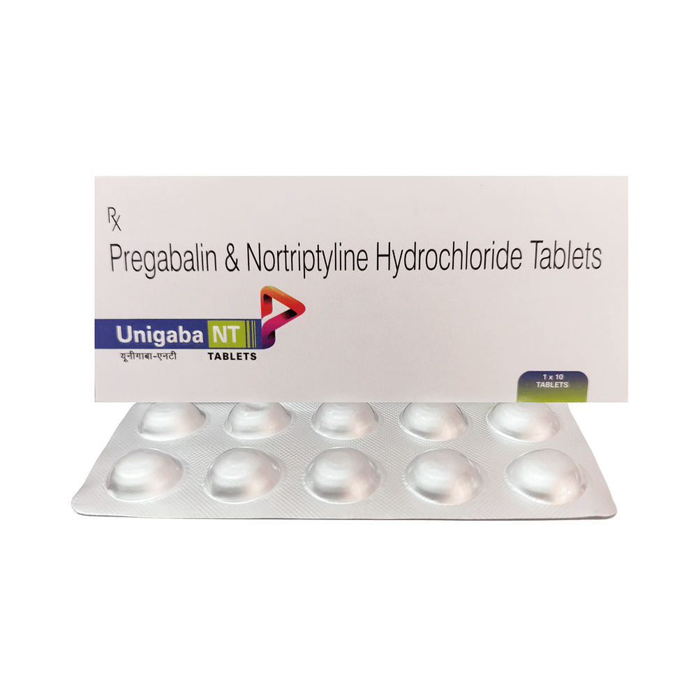 Unigaba-NT Tablet is a combination of two medicines: Pregabalin and Nortriptyline. Pregabalin is an alpha-2 delta ligand that decreases pain by modulating the calcium channel activity of the nerve cells. Nortriptyline is a tricyclic antidepressant that increases the levels of chemical messengers (serotonin and noradrenaline) that stop the movement of pain signals in the brain. Together, they relieve neuropathic pain (pain from damaged nerves).
