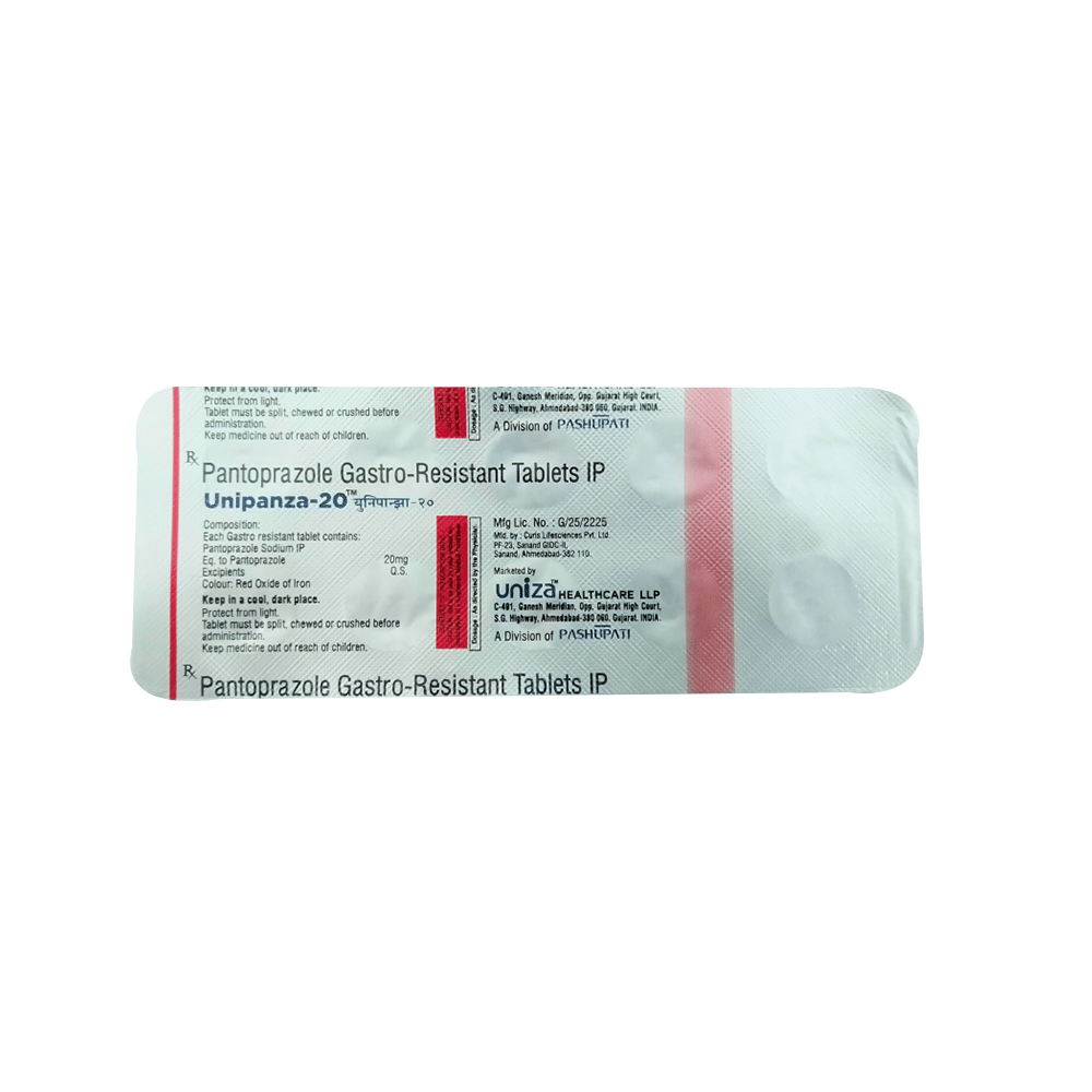 Unipanza 20 Tablet is a medicine that reduces the amount of acid produced in your stomach. It is used for treating acid-related diseases of the stomach and intestine such as heartburn, acid reflux, peptic ulcer disease, and Zollinger-Ellison syndrome. It provides relief from the symptoms and promotes healing. Unipanza 20 Tablet is also used to prevent stomach ulcers and acidity that may be seen with the prolonged use of painkillers. It belongs to a class of medicines known as proton pump inhibitors (PPIs). This medicine should be taken one hour before a meal, preferably in the morning. The dose will depend on your underlying condition and how you respond to the medicine. You should keep on taking it as prescribed even if your symptoms disappear quickly. You can increase the efficiency of the treatment by eating smaller meals more often and avoiding caffeinated drinks (like tea and coffee), and spicy or fatty foods.The most common side effects observed with this medicine include nausea, vomiting, headache, dizziness, flatulence, diarrhea, and stomach pain. These symptoms are generally mild but if they bother you or do not go away, consult your doctor. Long-term use of this medicine may lead to an increased risk of side effects. For instance, using this medicine for more than 1 year may increase your risk for bone fractures, especially with higher doses. Talk to your doctor about ways to prevent bone loss (osteoporosis), like taking calcium and vitamin D supplements.Before taking this medicine, you need to tell your doctor if you have severe liver problems, are taking medicines for HIV, have ever had an allergic reaction to similar medicines in the past, or suffer from bone loss (osteoporosis). Pregnant or breastfeeding women should also consult their doctor before taking it.