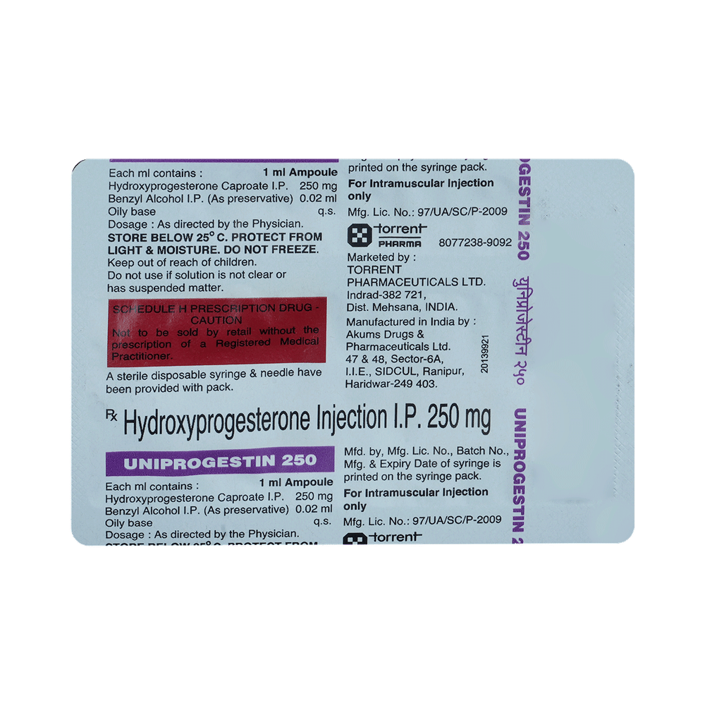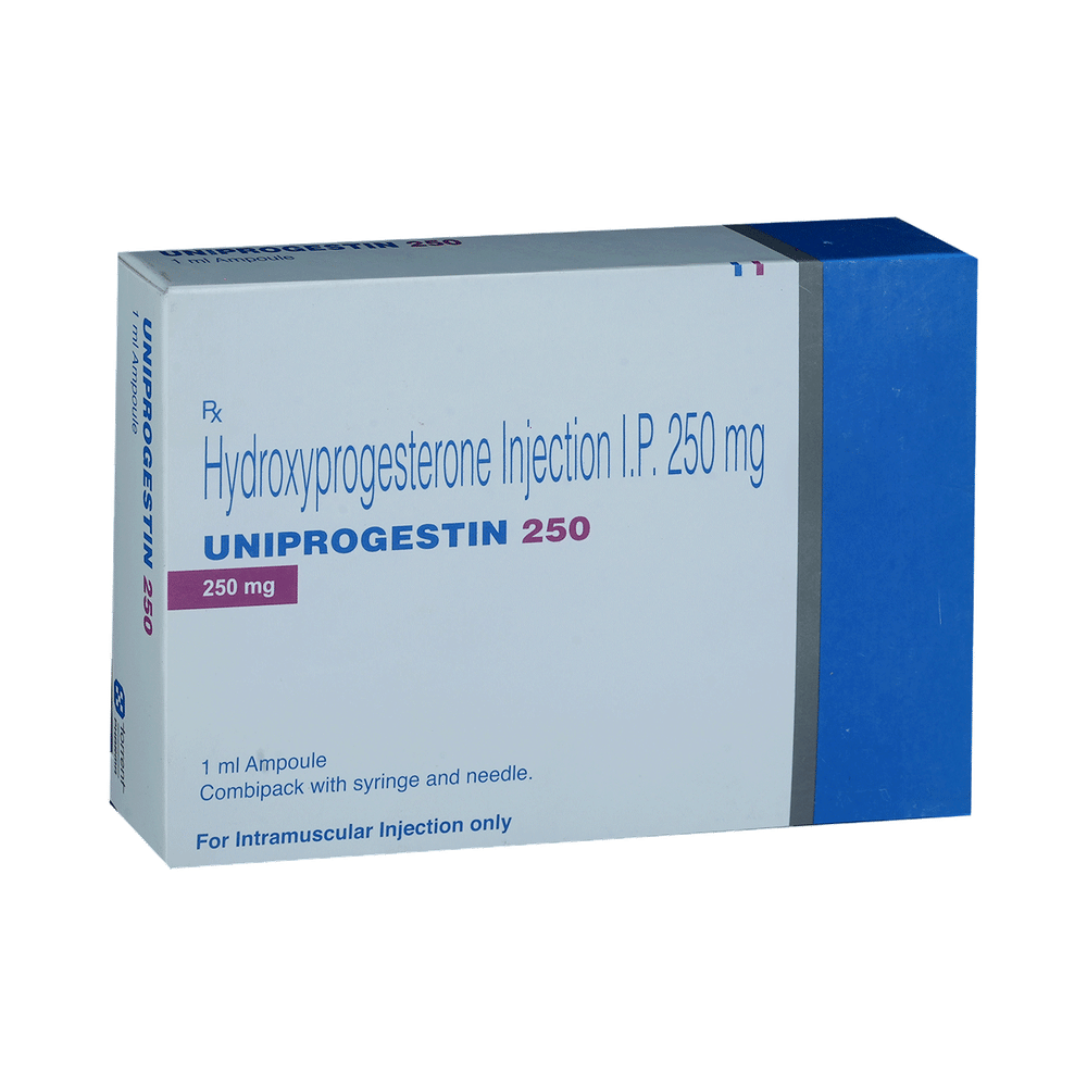 Uniprogestin 250 Injection is used to prevent premature labor in pregnant women in order to reduce the risk of giving birth too early (preterm birth). It prevents miscarriage and lowers the risk of premature birth in women who have had one premature delivery in the past. Uniprogestin 250 Injection is administered only by or under the supervision of a doctor. It should be taken as your doctor advice. Your doctor will decide how much you need to take and for how much time. You should take this injection for as long as it is prescribed for you.The most common side effects of this medicine include local site reactions at the injection site, nausea, itching, diarrhea, and rash. If any of these bothers you, let your doctor know. There may be ways of reducing or preventing them. It may affect blood sugar levels, so monitor your blood sugar regularly. It is better to inform the doctor if you notice yellowing of eyes or skin, dark urine, or stomach pain while using this medicine.Before taking this medicine inform doctor, if you have ever had any problems with your blood circulation or have diabetes, or any liver disease. Your doctor should also know about all other medicines you are taking as many of these may make this medicine less effective or change the way it works.