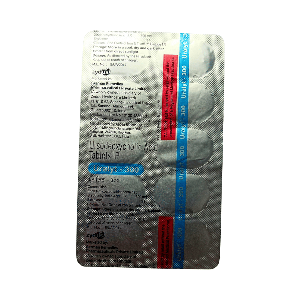 In Treatment of Gallbladder stonesUralyt 300 Tablet is a medicine that helps decreases the amount of cholesterol produced by your liver. It helps to break down cholesterol that has formed into “stones†in the gallbladder. It may take several months to completely dissolve the stone, so you need to take the medicine regularly and as long as the doctor has prescribed it for it to be effective. There might be other medicines and certain lifestyle changes that can reduce your cholesterol level and make gallstones less likely, consult with your doctor.In Treatment of Primary biliary cirrhosisPrimary biliary cholangitis is a type of liver disease that gradually gets worse over time. It does not always have symptoms but, over time, it can lead to liver failure. Uralyt 300 Tablet is used to treat this condition and may be used by itself or with other medicines. It can help prevent or delay liver damage in most people, especially if you start taking it in the early stages. Once you start this treatment, you will likely be taking it for the rest of your life. To make the medicine more effective and for general health benefits, you can help yourself by stopping smoking, keeping a healthy weight, and not drinking too much alcohol.show moreshow less