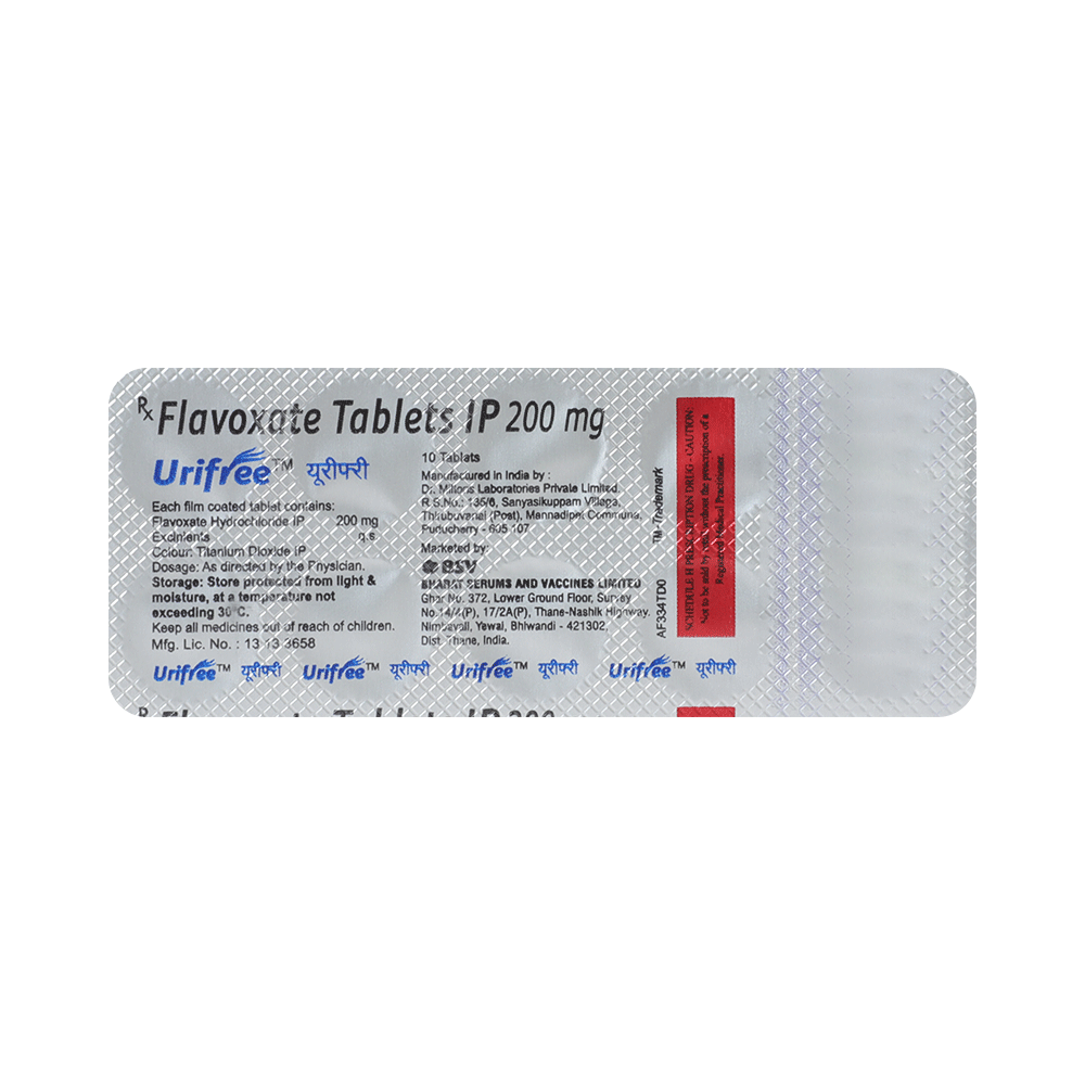 In Treatment of Muscle spasms of the urinary tractUrifree Tablet helps to treat uncontrollable contractions (spasms) of the bladder muscles that causes frequent urination, urgent need to urinate, and inability to control passing of urine. It also relieves painful, frequent, or nighttime urination and reduces urgency to urinate that may occur with some infections of the urinary tract. This medicine starts acting very quickly, within 2 to 3 hours and helps you live a better quality of life. Take it exactly as prescribed by the doctor.