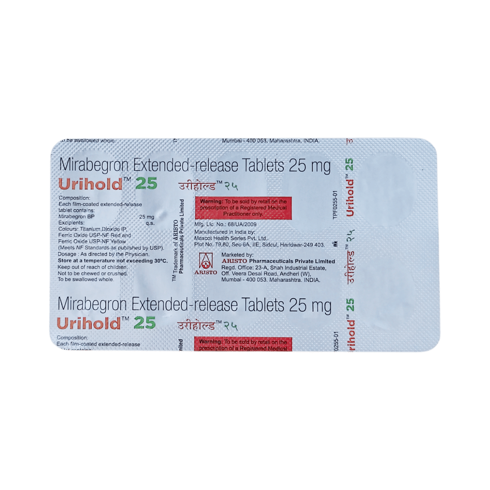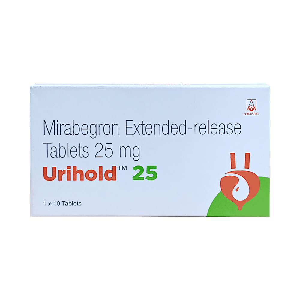 Urihold 25mg Tablet ER is a beta 3-receptor agonist. It works by activating the receptor in the bladder, causing the bladder muscles to relax. It prevents frequent, urgent or uncontrolled urination.