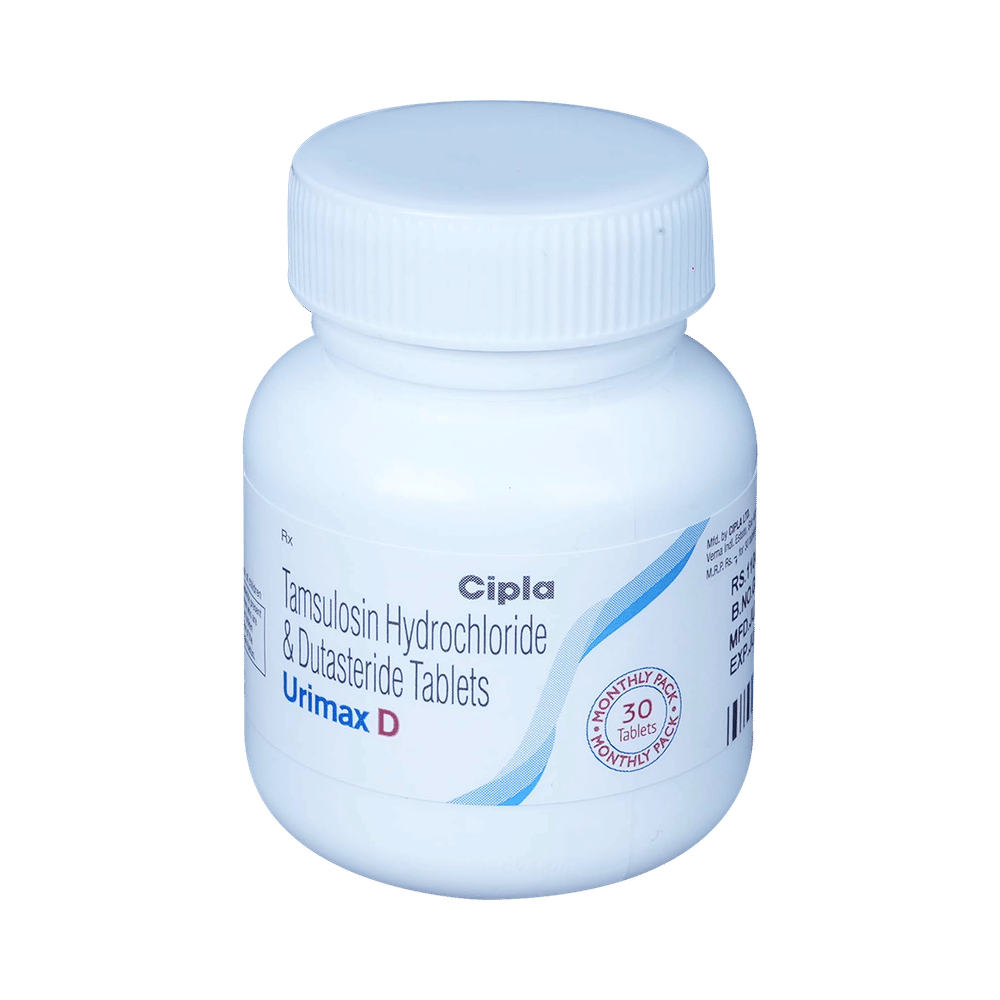 In Treatment of Benign prostatic hyperplasiaWhen your prostate gland becomes enlarged it can cause urinary problems such as difficulty passing urine and a need to go to the toilet frequently or urgently. It can also cause urine flow to be slower. If not treated, there is a risk that your urine flow will be completely blocked. Urimax D Tablet MR is a combination of two medicines: dutasteride and tamsulosin. Dutasteride reduces the size of your prostate by blocking the production of a hormone which causes it to grow. Tamsulosin works by relaxing muscles in the bladder and prostate. Together they can rapidly relieve the symptoms and make it easier for you to urinate. However, it may take up to 6 months to notice the full benefit. Take this medicine exactly as prescribed for maximum benefits.