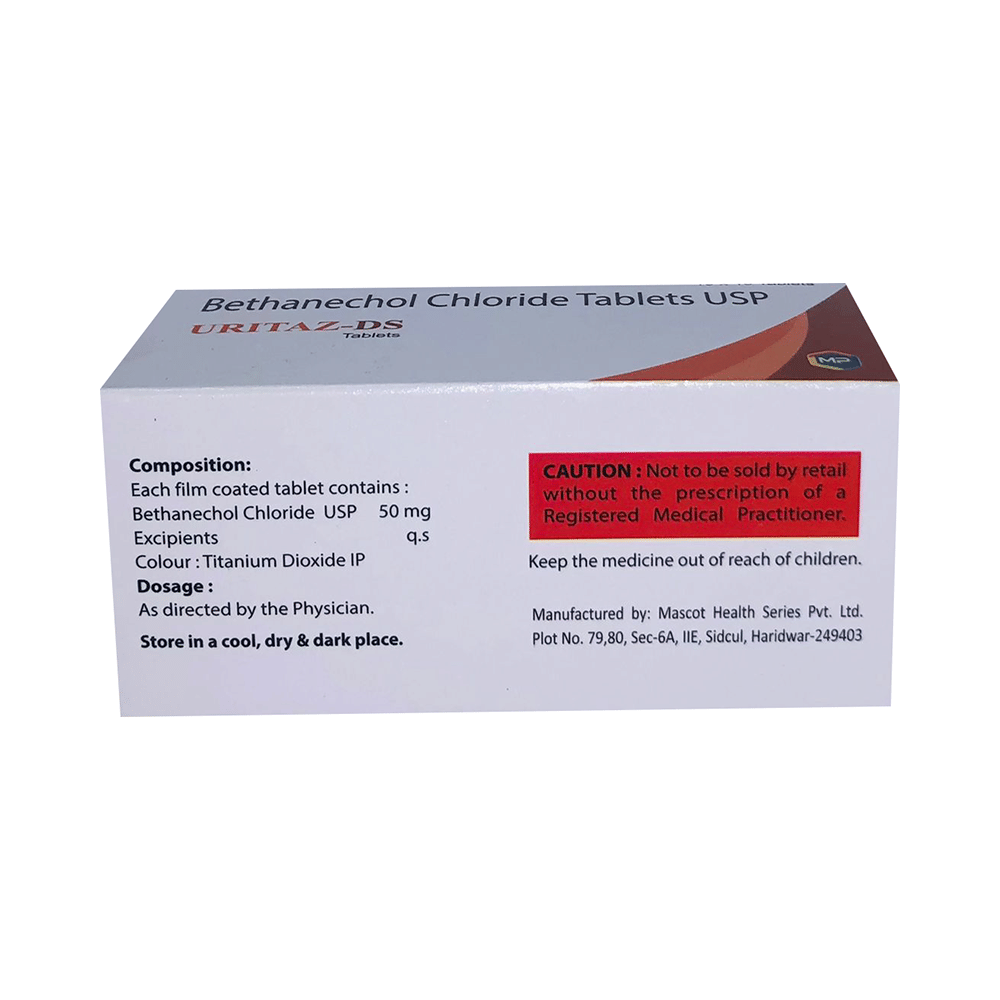 Uritaz DS Tablet is used in the treatment of urinary retention (inability to urinate), which usually occurs following surgery or after giving birth. It helps contract the muscles of the bladder, which further leads to urination. Uritaz DS Tablet is advised to take it in a dose and duration as per prescription. It can be taken on an empty stomach, but take it at a fixed time regularly. You should not stop taking the medicine without consulting the doctor, as it may lead to the worsening of your symptoms.Uritaz DS Tablet is generally well tolerated, with minimal side effects. However, in rare cases, some individuals may experience mild symptoms such as stomach cramps, nausea, belching, diarrhea, increased bowel sounds, excessive saliva, or a stronger urge to urinate. If these symptoms persist, worsen, or cause discomfort, consult your doctor.Before receiving the treatment, inform your doctor if you are on any medication for any health conditions. If you are pregnant, tell your doctor before taking Uritaz DS Tablet. Let your doctor also know about all the medications you are taking, as some medicines may interact with Uritaz DS Tablet.
