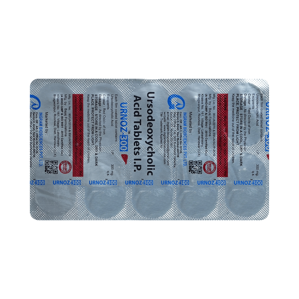 Urnoz 300 Tablet is a medicine used to dissolve certain gallstones and prevent them from forming. It helps break down the cholesterol that has converted into stones in your gallbladder, thereby dissolving the stones. It is also used to treat a type of liver disease called primary biliary cirrhosis. Urnoz 300 Tablet should be swallowed whole after a meal and with a glass of milk or water. The dose will depend on what you are being treated for and your health condition. Take it regularly to get maximum benefit, and keep taking it for as long as prescribed (several months or longer). Keep taking it even if your symptoms disappear.The most common side effects of Urnoz 300 Tablet are abdominal pain, diarrhea, hair loss, itching, nausea, and rash. Not everyone gets these side effects. If you are worried about them or they do not go away, let your doctor know. They may be able to suggest ways to manage them or prescribe an alternative medicine.Before taking this medicine, you should tell your doctor if you have an inflammation of the gallbladder or bile ducts, frequent cramp-like pain in your upper abdomen, coughing up blood, or gaining weight rapidly. Using this medicine can reduce or increase the effect of some other medicines, so tell your doctor about all the other medicines you are taking. Pregnant and breastfeeding women should consult their doctor before using this medicine to make sure it is safe for them.