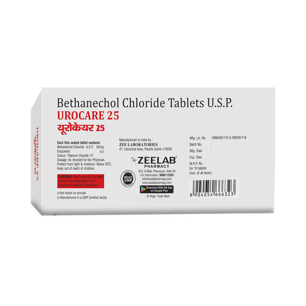 Urocare 25 Tablet is used in the treatment of urinary retention (inability to urinate), which usually occurs following surgery or after giving birth. It helps contract the muscles of the bladder, which further leads to urination. Urocare 25 Tablet is advised to take it in a dose and duration as per prescription. It can be taken on an empty stomach, but take it at a fixed time regularly. You should not stop taking the medicine without consulting the doctor, as it may lead to the worsening of your symptoms.Urocare 25 Tablet is generally well tolerated, with minimal side effects. However, in rare cases, some individuals may experience mild symptoms such as stomach cramps, nausea, belching, diarrhea, increased bowel sounds, excessive saliva, or a stronger urge to urinate. If these symptoms persist, worsen, or cause discomfort, consult your doctor.Before receiving the treatment, inform your doctor if you are on any medication for any health conditions. If you are pregnant, tell your doctor before taking Urocare 25 Tablet. Let your doctor also know about all the medications you are taking, as some medicines may interact with Urocare 25 Tablet.