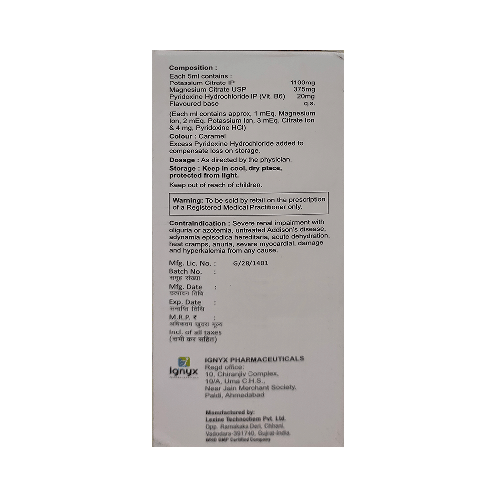 Salt Composition: Potassium Citrate (1100mg/5ml) + Magnesium Citrate (375mg/5ml) + Vitamin B6 (Pyridoxine) (20mg/5ml)