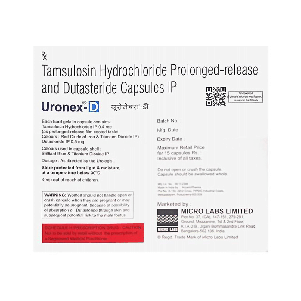 In Treatment of Benign prostatic hyperplasiaWhen your prostate gland becomes enlarged it can cause urinary problems such as difficulty passing urine and a need to go to the toilet frequently or urgently. It can also cause urine flow to be slower. If not treated, there is a risk that your urine flow will be completely blocked. Uronex-D 0.4mg/0.5mg Capsule is a combination of two medicines: dutasteride and tamsulosin. Dutasteride reduces the size of your prostate by blocking the production of a hormone which causes it to grow. Tamsulosin works by relaxing muscles in the bladder and prostate. Together they can rapidly relieve the symptoms and make it easier for you to urinate. However, it may take up to 6 months to notice the full benefit. Take this medicine exactly as prescribed for maximum benefits.