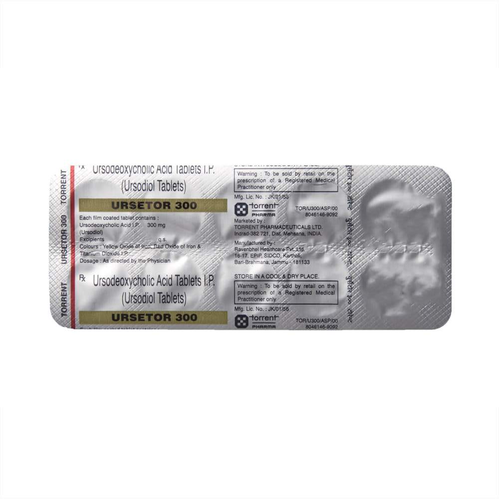 Ursetor 300 Tablet is a medicine used to dissolve certain gallstones and prevent them from forming. It helps break down the cholesterol that has converted into stones in your gallbladder, thereby dissolving the stones. It is also used to treat a type of liver disease called primary biliary cirrhosis. Ursetor 300 Tablet should be swallowed whole after a meal and with a glass of milk or water. The dose will depend on what you are being treated for and your health condition. Take it regularly to get maximum benefit, and keep taking it for as long as prescribed (several months or longer). Keep taking it even if your symptoms disappear.The most common side effects of Ursetor 300 Tablet are abdominal pain, diarrhea, hair loss, itching, nausea, and rash. Not everyone gets these side effects. If you are worried about them or they do not go away, let your doctor know. They may be able to suggest ways to manage them or prescribe an alternative medicine.Before taking this medicine, you should tell your doctor if you have an inflammation of the gallbladder or bile ducts, frequent cramp-like pain in your upper abdomen, coughing up blood, or gaining weight rapidly. Using this medicine can reduce or increase the effect of some other medicines, so tell your doctor about all the other medicines you are taking. Pregnant and breastfeeding women should consult their doctor before using this medicine to make sure it is safe for them.