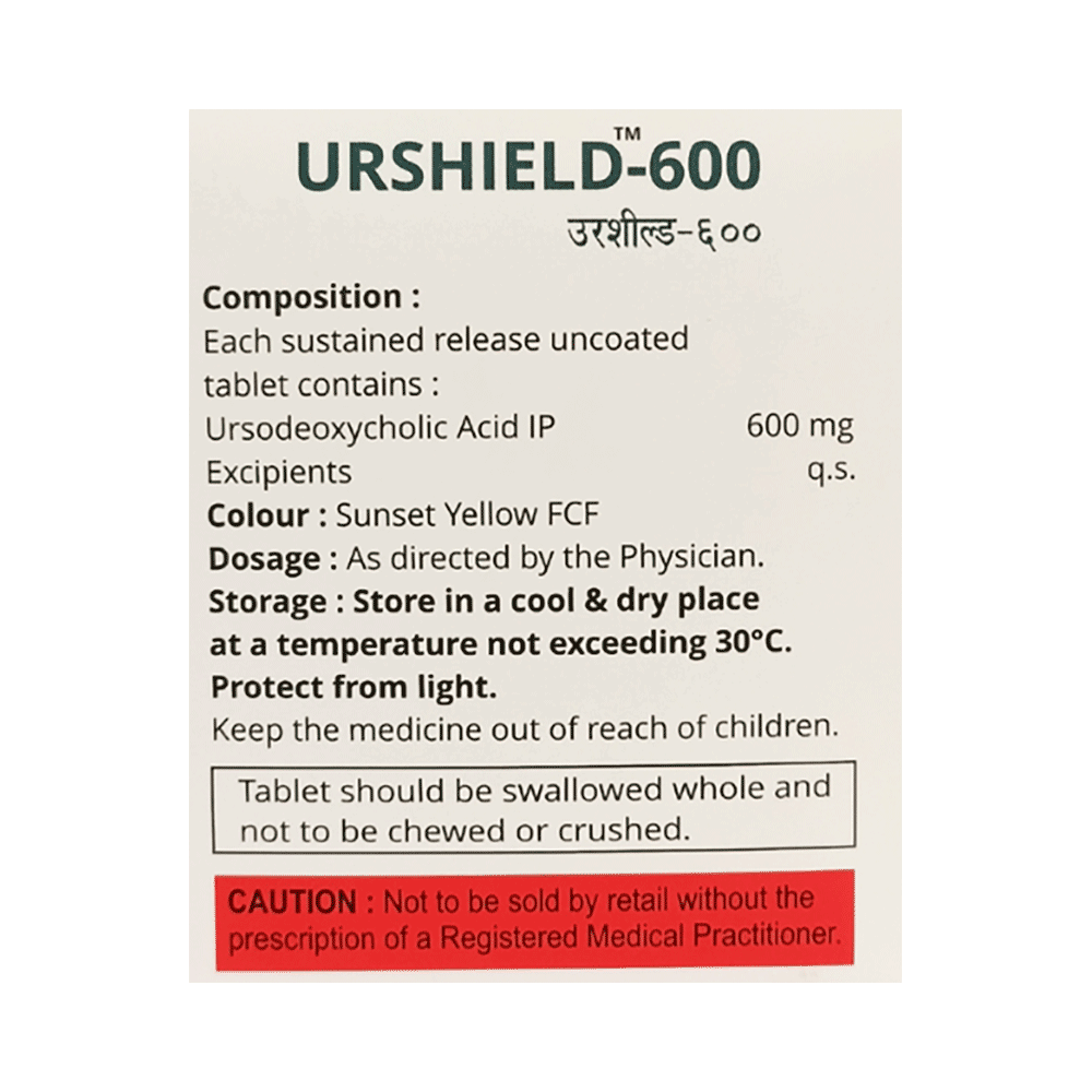 Urshield 600 Tablet SR is a medicine used to dissolve certain gallstones and prevent them from forming. It helps break down the cholesterol that has converted into stones in your gallbladder, thereby dissolving the stones. It is also used to treat a type of liver disease called primary biliary cirrhosis. Urshield 600 Tablet SR should be swallowed whole after a meal and with a glass of milk or water. The dose will depend on what you are being treated for and your health condition. Take it regularly to get maximum benefit, and keep taking it for as long as prescribed (several months or longer). Keep taking it even if your symptoms disappear.The most common side effects of Urshield 600 Tablet SR are abdominal pain, diarrhea, hair loss, itching, nausea, and rash. Not everyone gets these side effects. If you are worried about them or they do not go away, let your doctor know. They may be able to suggest ways to manage them or prescribe an alternative medicine.Before taking this medicine, you should tell your doctor if you have an inflammation of the gallbladder or bile ducts, frequent cramp-like pain in your upper abdomen, coughing up blood, or gaining weight rapidly. Using this medicine can reduce or increase the effect of some other medicines, so tell your doctor about all the other medicines you are taking. Pregnant and breastfeeding women should consult their doctor before using this medicine to make sure it is safe for them.
