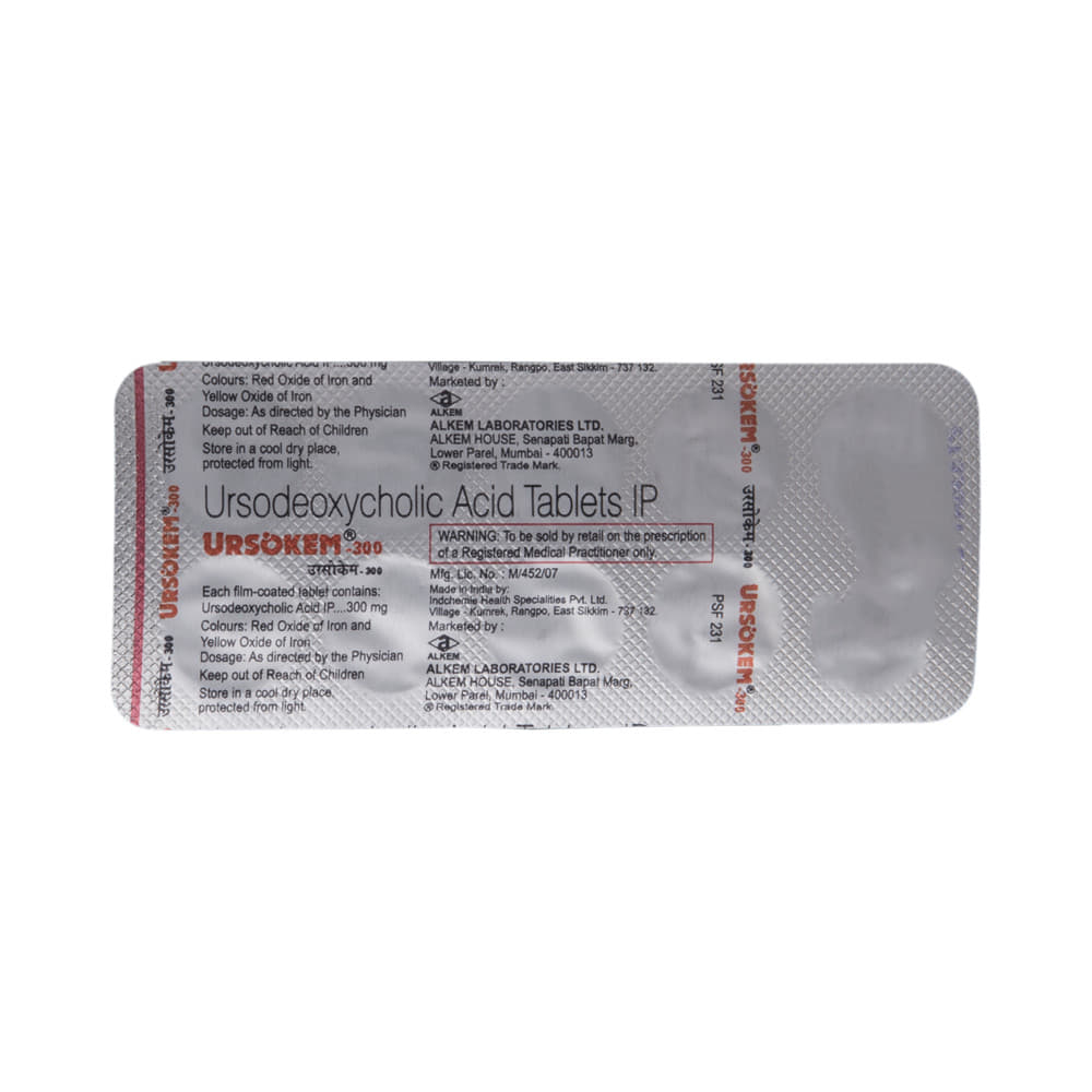 Ursokem 300 Tablet is a medicine used to dissolve certain gallstones and prevent them from forming. It helps break down the cholesterol that has converted into stones in your gallbladder, thereby dissolving the stones. It is also used to treat a type of liver disease called primary biliary cirrhosis. Ursokem 300 Tablet should be swallowed whole after a meal and with a glass of milk or water. The dose will depend on what you are being treated for and your health condition. Take it regularly to get maximum benefit, and keep taking it for as long as prescribed (several months or longer). Keep taking it even if your symptoms disappear.The most common side effects of Ursokem 300 Tablet are abdominal pain, diarrhea, hair loss, itching, nausea, and rash. Not everyone gets these side effects. If you are worried about them or they do not go away, let your doctor know. They may be able to suggest ways to manage them or prescribe an alternative medicine.Before taking this medicine, you should tell your doctor if you have an inflammation of the gallbladder or bile ducts, frequent cramp-like pain in your upper abdomen, coughing up blood, or gaining weight rapidly. Using this medicine can reduce or increase the effect of some other medicines, so tell your doctor about all the other medicines you are taking. Pregnant and breastfeeding women should consult their doctor before using this medicine to make sure it is safe for them.