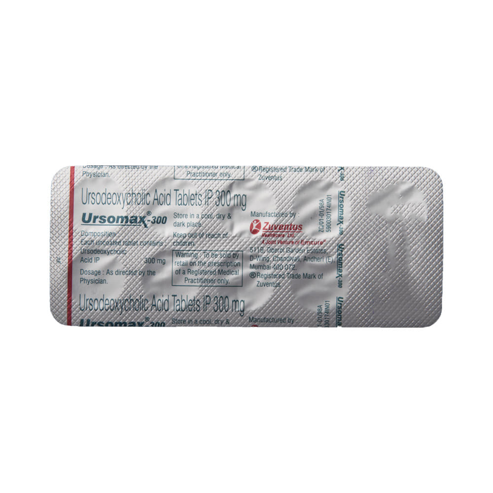 Ursomax 300 Tablet is a medicine used to dissolve certain gallstones and prevent them from forming. It helps break down the cholesterol that has converted into stones in your gallbladder, thereby dissolving the stones. It is also used to treat a type of liver disease called primary biliary cirrhosis. Ursomax 300 Tablet should be swallowed whole after a meal and with a glass of milk or water. The dose will depend on what you are being treated for and your health condition. Take it regularly to get maximum benefit, and keep taking it for as long as prescribed (several months or longer). Keep taking it even if your symptoms disappear.The most common side effects of Ursomax 300 Tablet are abdominal pain, diarrhea, hair loss, itching, nausea, and rash. Not everyone gets these side effects. If you are worried about them or they do not go away, let your doctor know. They may be able to suggest ways to manage them or prescribe an alternative medicine.Before taking this medicine, you should tell your doctor if you have an inflammation of the gallbladder or bile ducts, frequent cramp-like pain in your upper abdomen, coughing up blood, or gaining weight rapidly. Using this medicine can reduce or increase the effect of some other medicines, so tell your doctor about all the other medicines you are taking. Pregnant and breastfeeding women should consult their doctor before using this medicine to make sure it is safe for them.