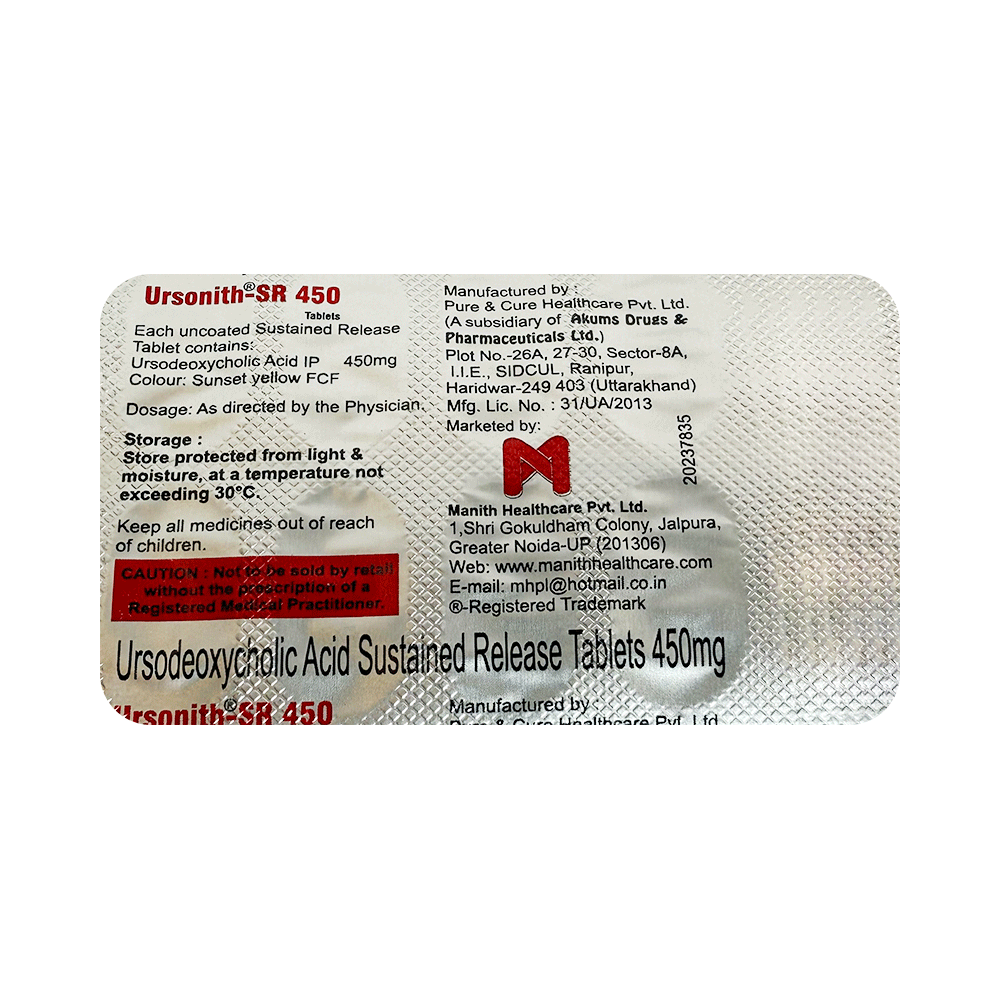 Ursonith-SR 450 Tablet is a medicine used to dissolve certain gallstones and prevent them from forming. It helps break down the cholesterol that has converted into stones in your gallbladder, thereby dissolving the stones. It is also used to treat a type of liver disease called primary biliary cirrhosis. Ursonith-SR 450 Tablet should be swallowed whole after a meal and with a glass of milk or water. The dose will depend on what you are being treated for and your health condition. Take it regularly to get maximum benefit, and keep taking it for as long as prescribed (several months or longer). Keep taking it even if your symptoms disappear.The most common side effects of Ursonith-SR 450 Tablet are abdominal pain, diarrhea, hair loss, itching, nausea, and rash. Not everyone gets these side effects. If you are worried about them or they do not go away, let your doctor know. They may be able to suggest ways to manage them or prescribe an alternative medicine.Before taking this medicine, you should tell your doctor if you have an inflammation of the gallbladder or bile ducts, frequent cramp-like pain in your upper abdomen, coughing up blood, or gaining weight rapidly. Using this medicine can reduce or increase the effect of some other medicines, so tell your doctor about all the other medicines you are taking. Pregnant and breastfeeding women should consult their doctor before using this medicine to make sure it is safe for them.