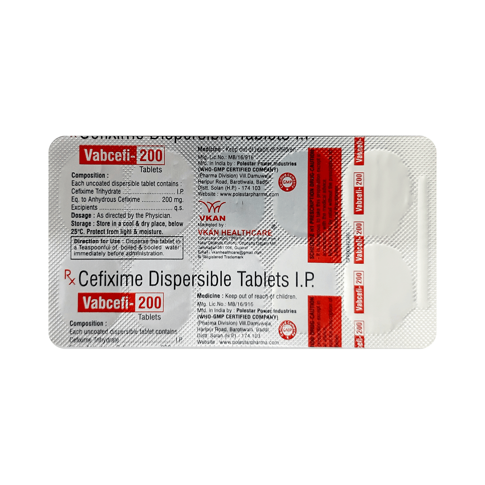 In Treatment of Bacterial infectionsVabcefi 200 Tablet DT is an antibiotic medicine that works by killing the infection-causing bacteria in your body. It is effective for bacterial infections of the lungs, throat, and urinary tract among others. This medicine usually makes you feel better within a few days, but you should continue taking it as prescribed even when you feel better. Stopping it early may make the infection come back and harder to treat.