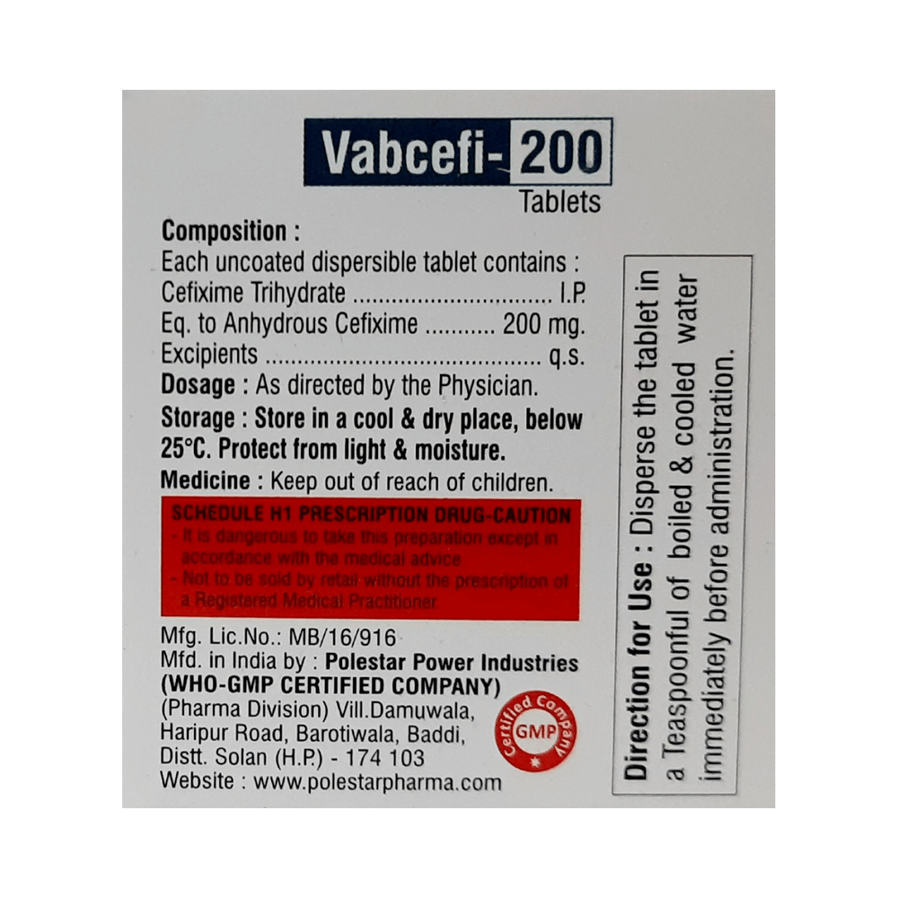 Vabcefi 200 Tablet DT is an antibiotic belonging that is used to treat a variety of bacterial infections. It is effective in infections of the respiratory tract (eg. pneumonia), urinary tract, ear, nasal sinus, throat, and some sexually transmitted diseases. Vabcefi 200 Tablet DT should be given under the supervision of a doctor or health professional. Use it regularly at evenly spaced intervals as per the schedule prescribed by your doctor. Using it at the same time every day will help you remember to take it. The dose will depend on what you are being treated for, but you should always complete the full course of this antibiotic as prescribed by your doctor. Do not stop taking it until you have finished, even when you feel better. If you stop taking it early, some bacteria may survive and the infection may come back or worsen. It will not work for viral infections such as flu or common cold. Using any antibiotic when you do not need it can make it less effective for future infections.The most common side effects of this medicine include nausea, stomach pain, indigestion, and diarrhea. These are usually mild but let your doctor know if they bother you or do not go away.Before taking it, you should let your doctor know if you are allergic to any antibiotics or have any kidney or liver problems. You should also let your healthcare team know all other medicines you are taking as they may affect, or be affected by this medicine. This medicine is generally regarded as safe to use during pregnancy and breastfeeding if prescribed by a doctor.
