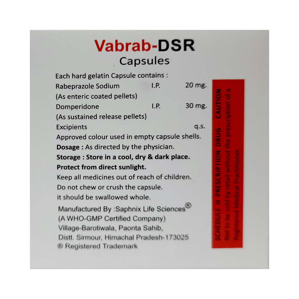 Vabrab-DSR Capsule is a combination medicine used to treat gastroesophageal reflux disease (acid reflux). It works by relieving the symptoms of acidity such as heartburn, stomach pain, or irritation. It also neutralizes the acid and promotes easy passage of gas to reduce stomach discomfort. Vabrab-DSR Capsule is taken without food in a dose and duration as advised by the doctor. The dose you are given will depend on your condition and how you respond to the medicine. You should keep taking this medicine for as long as your doctor recommends. If you stop treatment too early your symptoms may come back and your condition may worsen. Let your healthcare team know about all other medications you are taking as some may affect, or be affected by this medicine.The most common side effects are diarrhea, stomach pain, dryness in the mouth, headache, flatulence, and weakness. Most of these are temporary and usually resolve with time. Contact your doctor straight away if you are at all concerned about any of these side effects. This medicine may cause dizziness and sleepiness, so do not drive or do anything that requires mental focus until you know how this medicine affects you. Avoid drinking alcohol while taking this medicine as it can worsen your sleepiness. Lifestyle modifications like having cold milk and avoiding hot tea, coffee, spicy food or chocolate can help you to get better results.Before you start taking this medicine it is important to inform your doctor if you are suffering from kidney or liver disease. You should also tell your doctor if you are pregnant, planning pregnancy or breastfeeding.