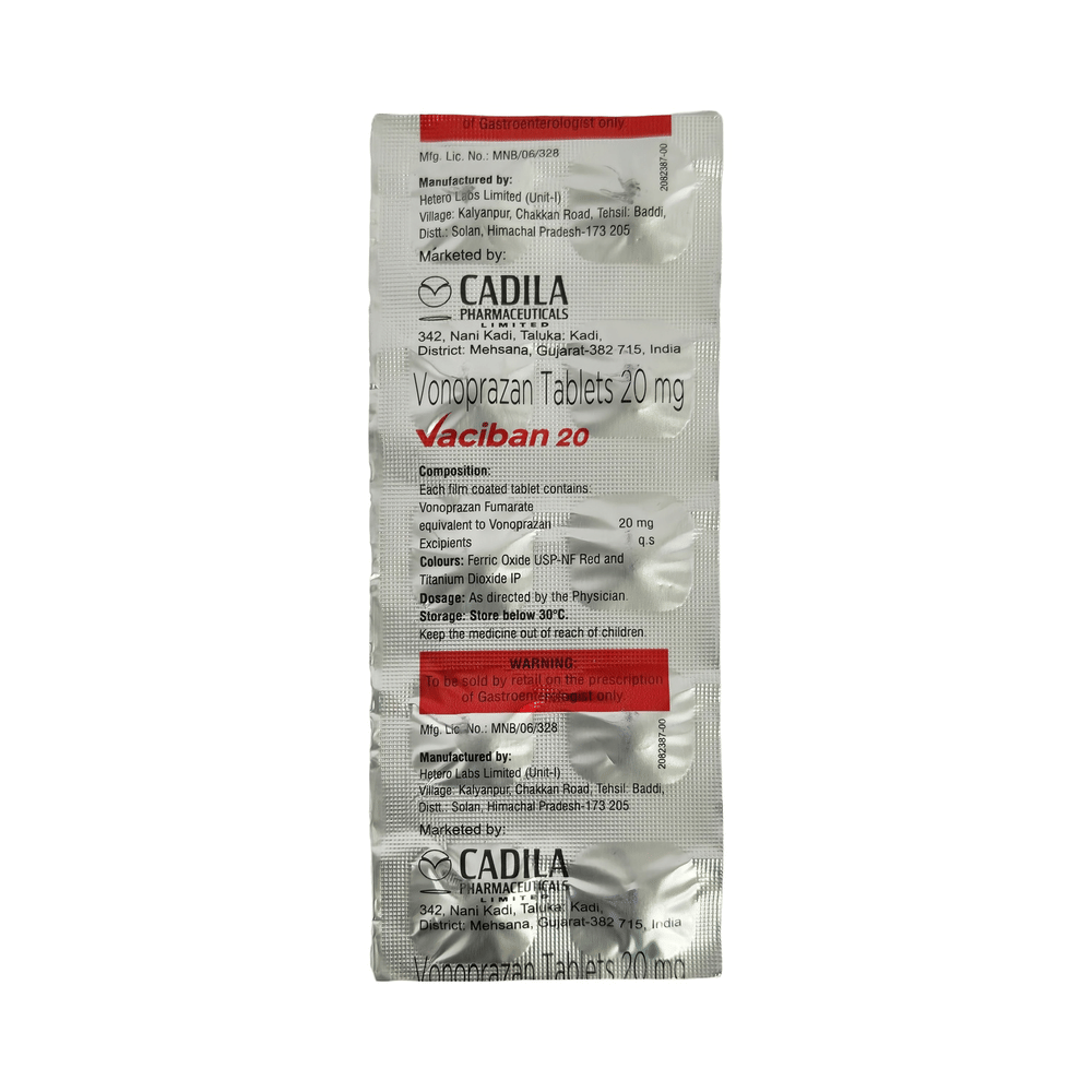 Vaciban 20mg Tablet works by decreasing the amount of acid your stomach makes. Decreasing excess stomach acid can help ulcers heal and relieve symptoms such as heartburn and stomach pain.