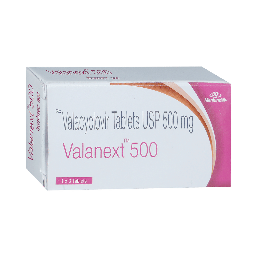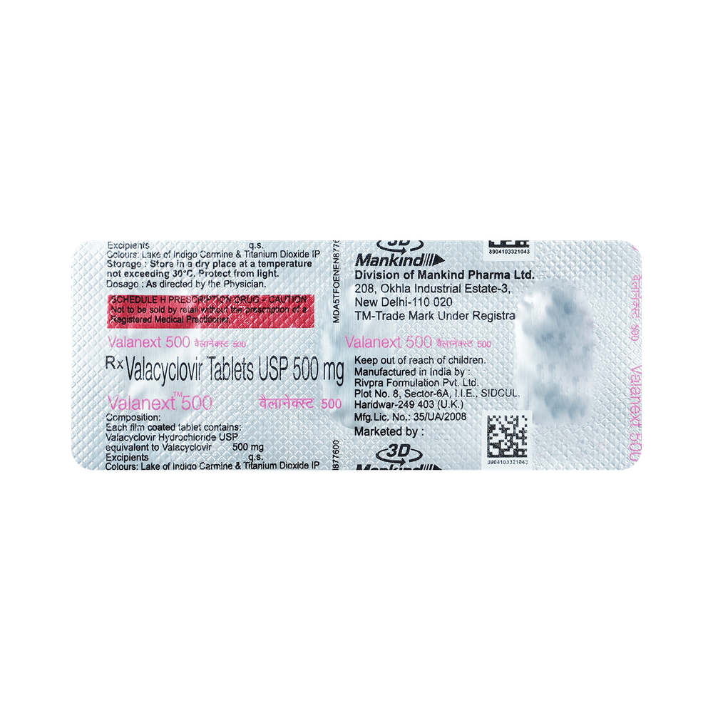 Valanext 500mg Tablet is an antiviral medicine used in the treatment of herpes labialis, genital herpes infection, and herpes zoster infections. It prevents the multiplication of viruses in human cells and clears up the infection. Valanext 500mg Tablet should be taken in the dose and duration as advised by your doctor. Do not skip any doses and finish the full course of treatment even if you feel better. It may be taken with or without food, but it is better to take it at a fixed time. If you miss a dose, take it as soon as possible. However, if it is almost time for your next dose, skip the missed dose and go back to your regular schedule. Do not double the dose. You should drink plenty of water while on treatment with this medicine as it helps to prevent dehydration and kidney damage. It may lead to a few common side effects like headache, vomiting, dizziness, diarrhea, itching (pruritus), and abdominal pain. Inform your doctor if these side effects persist for a longer duration. Please consult your doctor if you are pregnant, planning to conceive or breastfeeding.