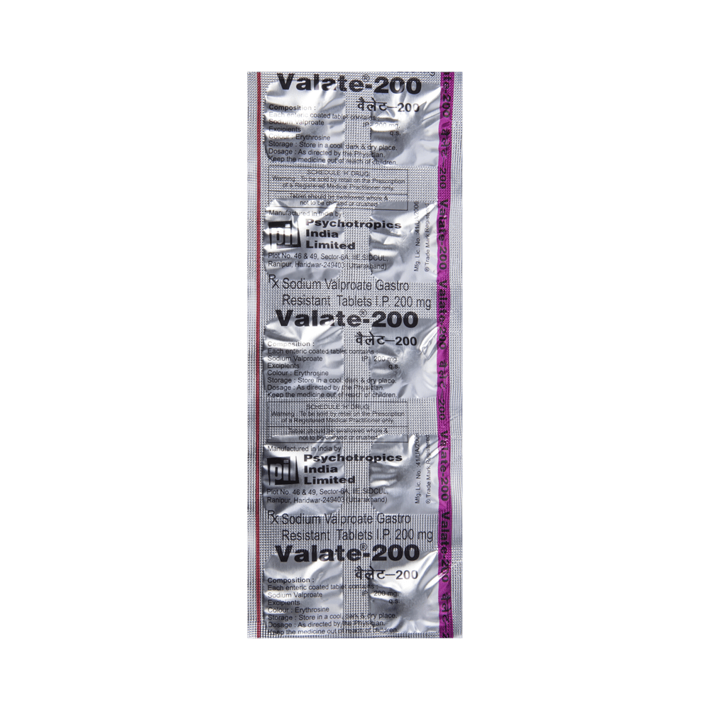 In Epilepsy/SeizuresValate 200 Tablet is an anticonvulsant (or anti-epileptic) medicine that works by decreasing the nerve impulses which cause the seizures. By controlling the frequency of seizures, it will help you go about your daily activities with more confidence. It helps reduce symptoms such as confusion, uncontrollable jerking movements, loss of awareness, and fear or anxiety.This medicine is not associated with any physical or psychological dependence (addiction) but it should not be stopped suddenly. It must be taken regularly as prescribed to be effective. Missing doses may trigger a seizure.In Bipolar disorderValate 200 Tablet works to restore the normal balance of nerve activity in your brain. It can help prevent extreme changes in mood and help you feel less agitated. You may experience fewer episodes of low mood. It can take several weeks for this medicine to work and you may still feel low during this time. It is likely that you will take this medicine for at least six months but possibly much longer. It needs to be taken regularly to work effectively. Do not stop taking it unless your doctor advises you to. You should continue to eat well and keep fit to reduce symptoms of bipolar disorder.show moreshow less