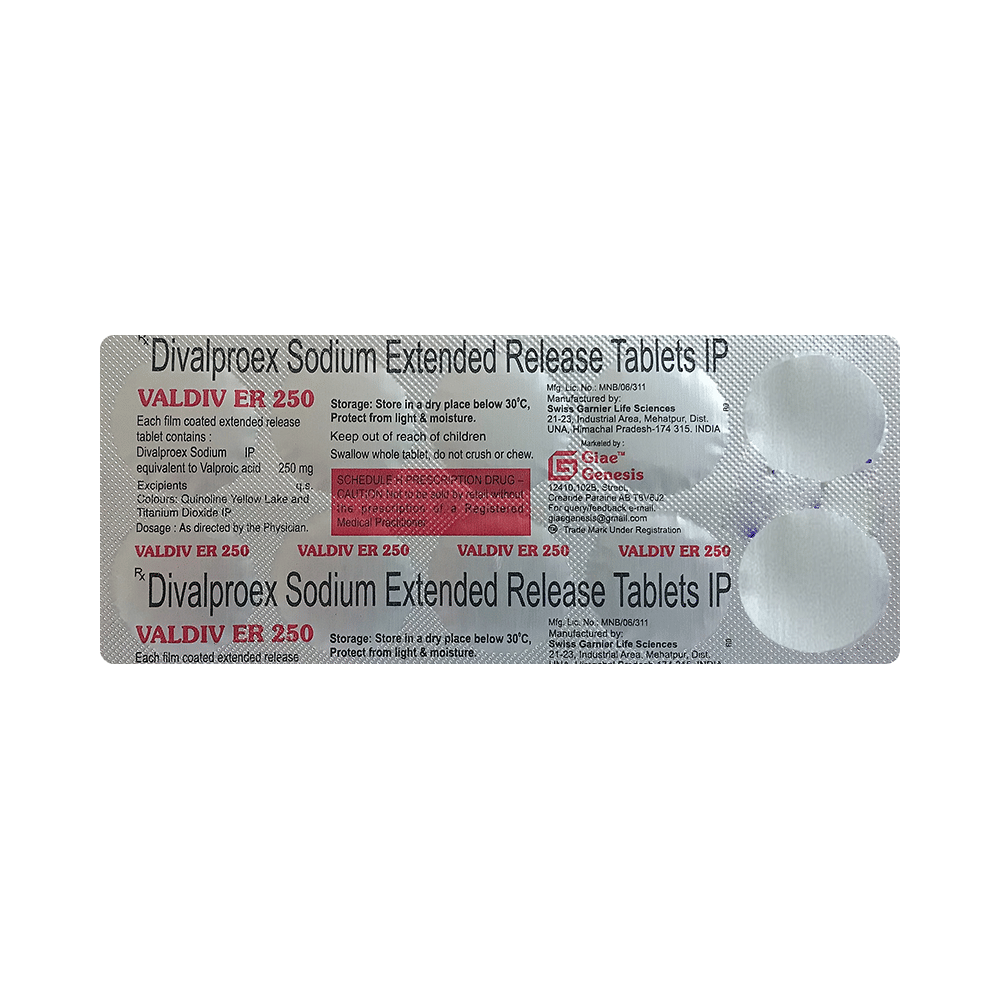 Valdiv ER 250 Tablet is a medication used to treat epilepsy, seizures, bipolar disorder, mania, trigeminal neuralgia, and migraines. It works by stabilizing brain activity. Always use it under medical supervision for safe and effective treatment. Valdiv ER 250 Tablet may be used alone or in combination with other medicines. Your doctor will determine the appropriate dose and frequency to effectively control your symptoms. You can take this medicine with or without food, but for the best results, take it at the same time each day. It usually takes a couple of weeks to work. It is important to take this medicine regularly and for as long as you are advised, even if you feel well. Missing doses may trigger seizures, and if you stop, your condition may get worse. It should never be stopped suddenly.The most common side effects of Valdiv ER 250 Tablet include headache, constipation, nausea, vomiting, dizziness, weight gain, rash, back pain, and abdominal pain. Most of these are not serious. Continue taking the medicine, but consult your doctor if these side effects persist or become bothersome. However, if you notice a skin rash or redness, tell your doctor straight away. Long-term treatment with this medicine can cause osteoporosis (reduced bone mass) and increase your risk of breaking a bone. Also, Valdiv ER 250 Tablet may rarely lead to suicidal thoughts and behaviors. If your mood becomes depressed, tell your doctor.Valdiv ER 250 Tablet may not be suitable for everybody. Before using it, tell your doctor if you have ever had heart problems, kidney or liver disease, difficulty urinating, depression, or suicidal thoughts. Some medicines can interfere with it and should not be taken together, so tell your doctor about all the medicines you are taking to make sure it is safe for you. If you are pregnant, do not take this medicine without asking your doctor. Avoid drinking alcohol, as it may enhance certain side effects and increase the risk of seizures. You may need frequent blood tests to help your doctor make sure you are taking the right dose both before you start and while you are using it.