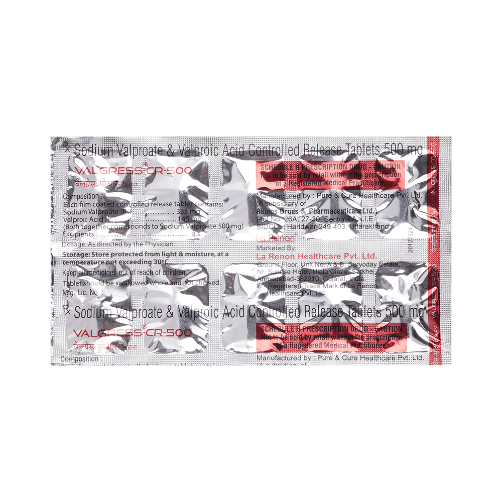 Valgress -CR 500 Tablet is a combination of two antiepileptic medicines: Sodium Valproate and Valproic Acid.