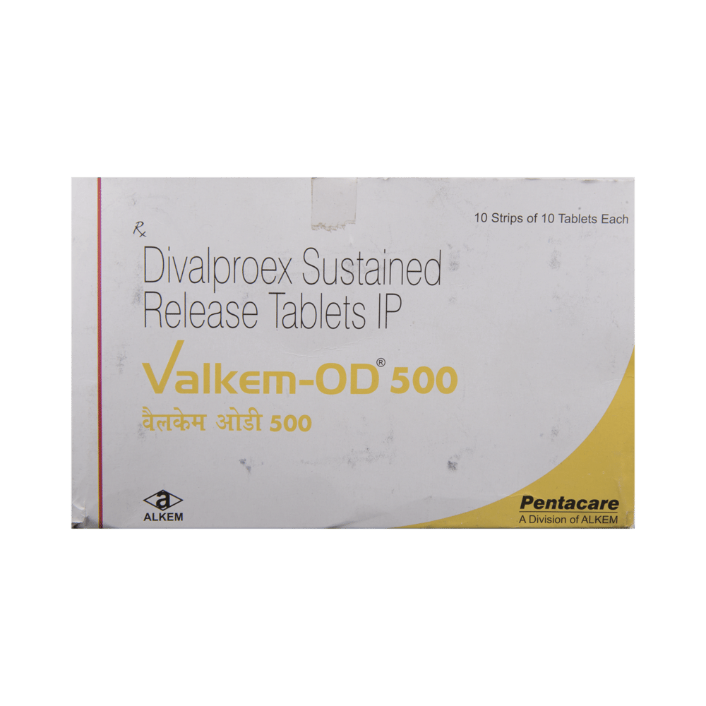 Valkem-OD 500 Tablet SR is a medication used to treat epilepsy, seizures, bipolar disorder, mania, trigeminal neuralgia, and migraines. It works by stabilizing brain activity. Always use it under medical supervision for safe and effective treatment. Valkem-OD 500 Tablet SR may be used alone or in combination with other medicines. Your doctor will determine the appropriate dose and frequency to effectively control your symptoms. You can take this medicine with or without food, but for the best results, take it at the same time each day. It usually takes a couple of weeks to work. It is important to take this medicine regularly and for as long as you are advised, even if you feel well. Missing doses may trigger seizures, and if you stop, your condition may get worse. It should never be stopped suddenly.The most common side effects of Valkem-OD 500 Tablet SR include headache, constipation, nausea, vomiting, dizziness, weight gain, rash, back pain, and abdominal pain. Most of these are not serious. Continue taking the medicine, but consult your doctor if these side effects persist or become bothersome. However, if you notice a skin rash or redness, tell your doctor straight away. Long-term treatment with this medicine can cause osteoporosis (reduced bone mass) and increase your risk of breaking a bone. Also, Valkem-OD 500 Tablet SR may rarely lead to suicidal thoughts and behaviors. If your mood becomes depressed, tell your doctor.Valkem-OD 500 Tablet SR may not be suitable for everybody. Before using it, tell your doctor if you have ever had heart problems, kidney or liver disease, difficulty urinating, depression, or suicidal thoughts. Some medicines can interfere with it and should not be taken together, so tell your doctor about all the medicines you are taking to make sure it is safe for you. If you are pregnant, do not take this medicine without asking your doctor. Avoid drinking alcohol, as it may enhance certain side effects and increase the risk of seizures. You may need frequent blood tests to help your doctor make sure you are taking the right dose both before you start and while you are using it.