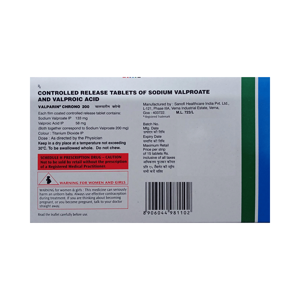 Valparin Chrono 200 Tablet CR is a combination of two antiepileptic medicines: Sodium Valproate and Valproic Acid.
