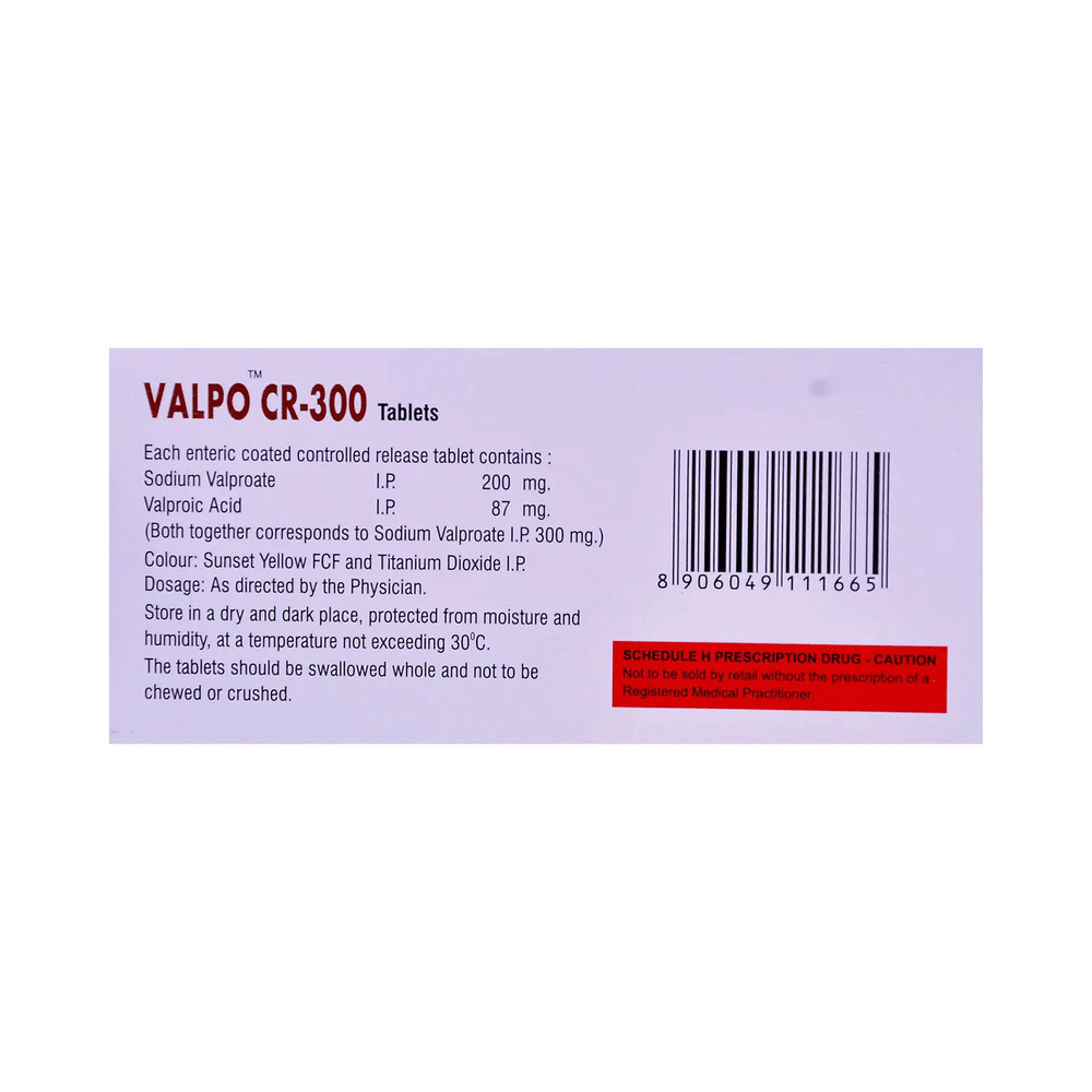 Valpo 300mg Tablet CR belongs to a group of medicines called anti-epileptics. It is used to treat epilepsy. It works by preventing extreme mood swings and abnormal brain signals that trigger seizures (fits). Valpo 300mg Tablet CR can be used alone or in combination with other medicines. Your doctor will decide the correct dose for you. The dose may increase gradually until your condition is stable. This medicine may take several weeks to work, but it is important to take it regularly to get the benefit. Do not stop taking it, even if you feel fine, unless your doctor advises you to. You may have more seizures, or they may get worse.The most common side effects of this medicine include hair fall/loss, loss of smell, skin rashes, headache, feeling or being sick, difficulty sleeping, dizziness, and feeling sleepy or drowsy. Most side effects wear off, but if they bother you or do not go away, tell your doctor. There may be ways of preventing or reducing these effects. Long-term treatment can cause weakness in your bones (osteoporosis), increasing your risk of breaking a bone.Before taking this medicine, tell your doctor if you have kidney or liver problems, meningitis or depression, or suicidal thoughts. Also, let your healthcare team know about all other medications you are using, as some may affect, or be affected by, this medicine, including contraceptive pills. If you are pregnant or breastfeeding, Valpo 300mg Tablet CR can be taken if it is needed, but the dose may be adjusted. You should avoid driving or riding a bicycle if this medicine makes you drowsy or dizzy. You may need frequent blood tests to check how you are responding to this medicine.