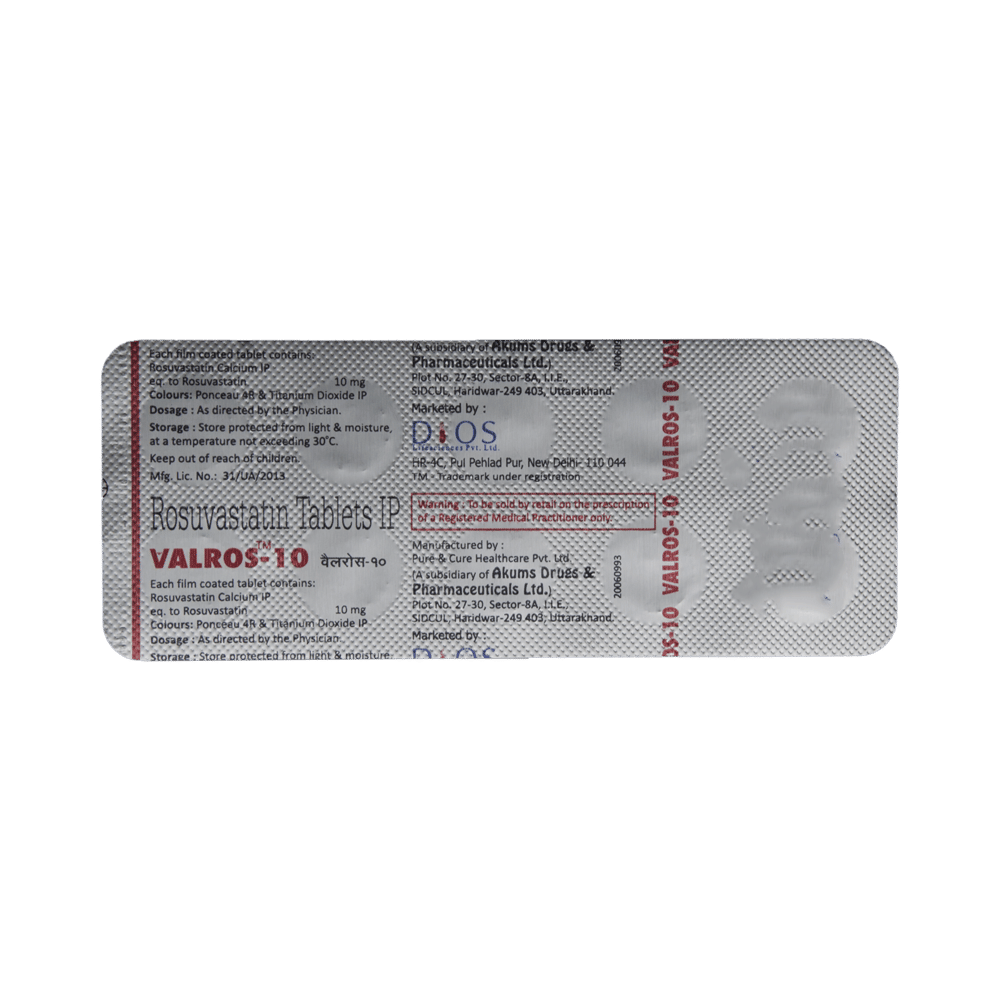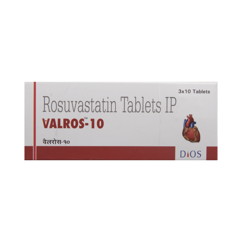 Valros 10 Tablet belongs to a group of medicines called statins. It is used to lower cholesterol and triglyceride levels and reduce the risk of heart disease. Cholesterol is a fatty substance that builds up in your blood vessels and causes narrowing, which may lead to a heart attack or stroke. Valros 10 Tablet is a widely prescribed medicine and is regarded as safe for long-term use. It can be taken with a meal or on an empty stomach. You can take it at any time of the day, but try to take it at the same time each day. Most people with high cholesterol do not feel ill. However, stopping your medicine may increase your cholesterol levels, making your condition worse and increasing your risk of heart disease and stroke.It is important to have your cholesterol levels checked regularly. This medicine is only one part of the treatment program, which should also include a healthy diet, regular exercise, smoking cessation, moderation of alcohol intake, and weight reduction. You can eat normally while taking this medicine, but try to avoid foods that are high in fat.Common side effects of this medicine include muscle pain, weakness, nausea, headache, and abdominal pain. These are usually mild and disappear after a short time. Consult your doctor if they persist or if you notice any yellowing of your eyes or get repeated or unexplained muscle pains.This medicine should not be used in conditions such as liver disease. Also, pregnant women and breastfeeding women should not take this medicine, as it may harm the developing baby. Diabetic patients should monitor their blood sugar levels while taking this medicine, as it may lead to an increase in blood sugar levels.