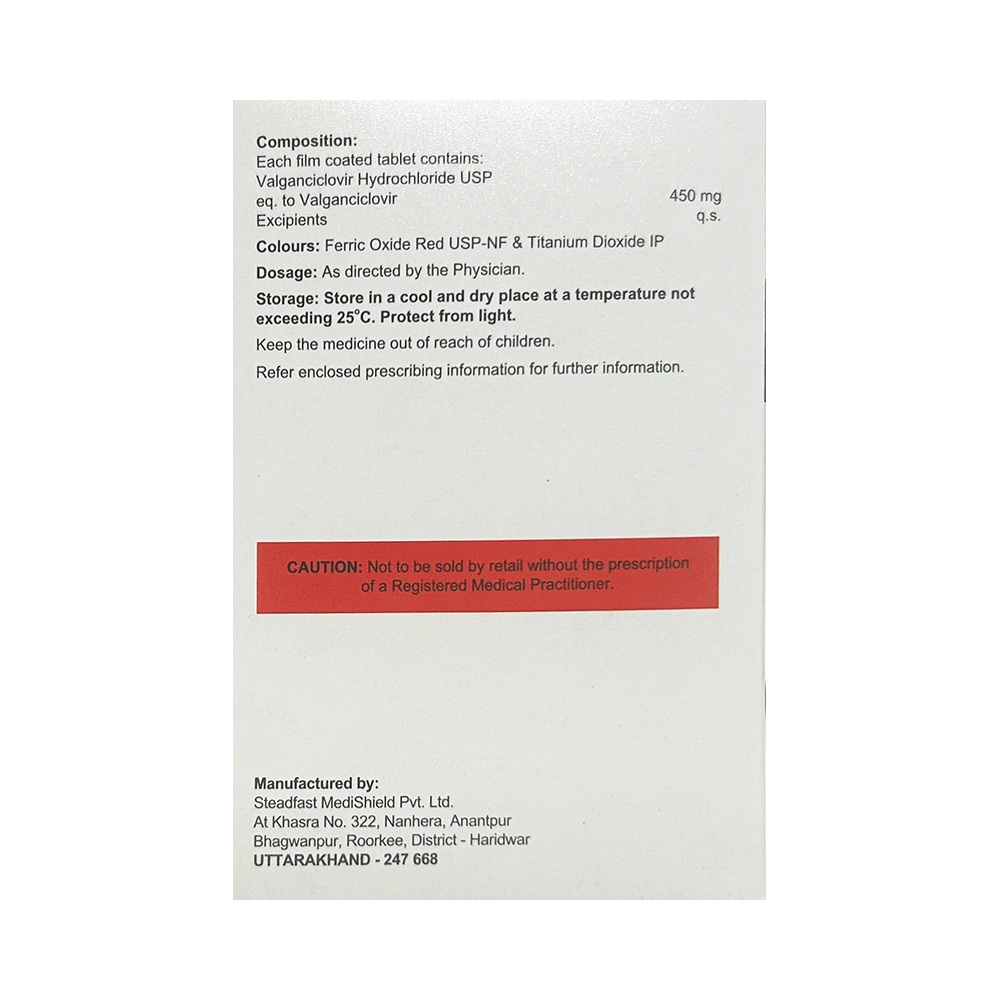 In Treatment of Cytomegalovirus InfectionCytomegalovirus infection is a common virus infection which may have no symptoms at all or may have symptoms like fever and fatigue. Severe infection may show symptoms involving the eyes, brain, or other internal organs. This virus is spread through sexual and nonsexual contact with body secretions in people who are immunocompromised or those who have undergone any transplant. Valstead 450mg Tablet helps to prevent multiplication of the infection causing virus and treats the infection. Keep taking it in the dose and duration prescribed by the doctor to get maximum benefit.